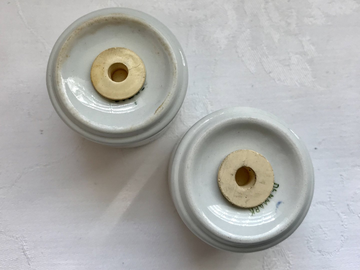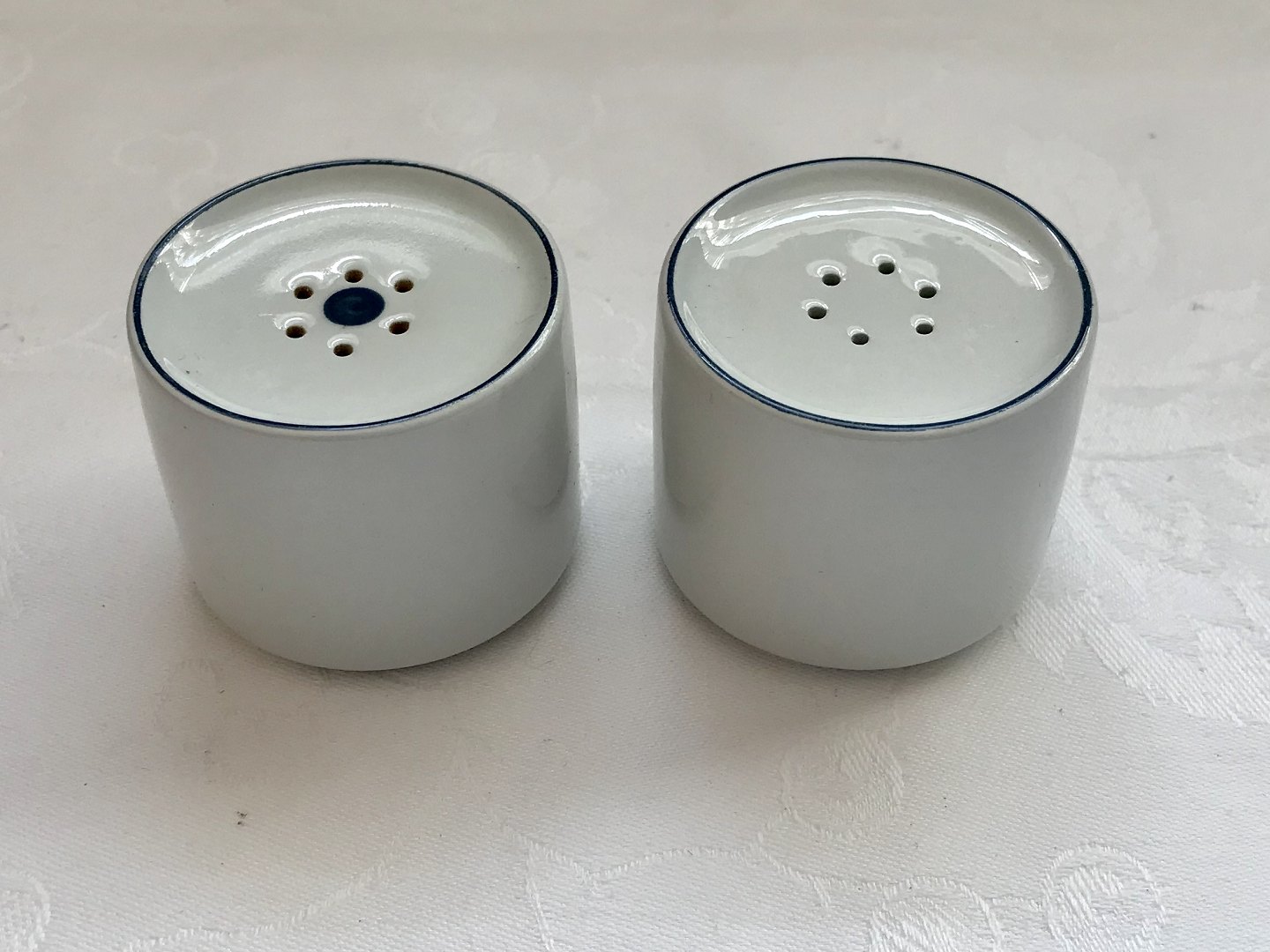 | Royal Copenhagen, Aluminia, Blå kant, Salt & Pebersæt, 4cm høj, 4,5cm i diameter, Design Grethe Meyer *Pæn stand*