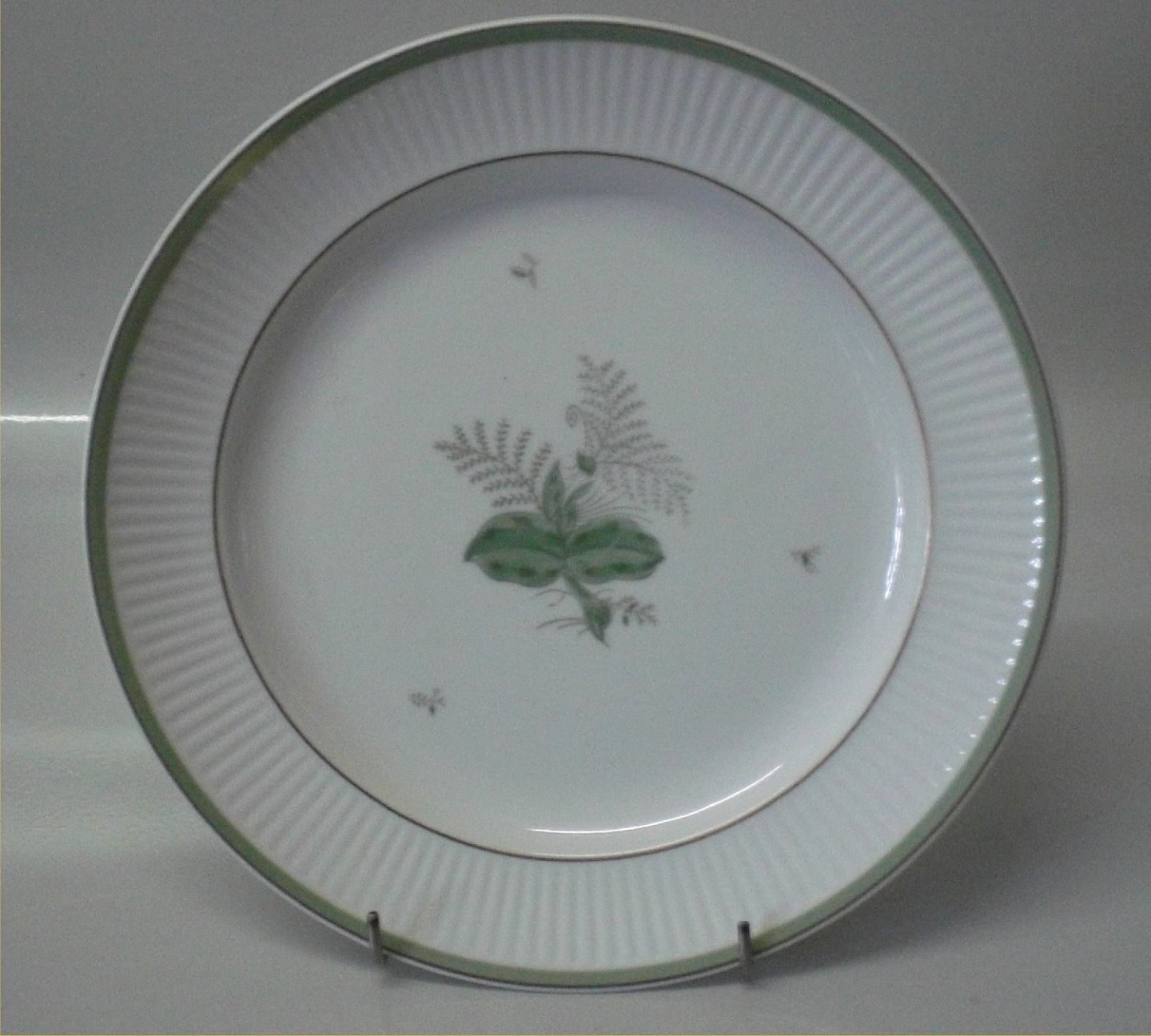 1513-14061 Tallerken 22,5 cm Grøn Melodi #1513 (Kgl.) Rillet form, hvid glasur, grøn dekoration, grønt båd og guldfilet.