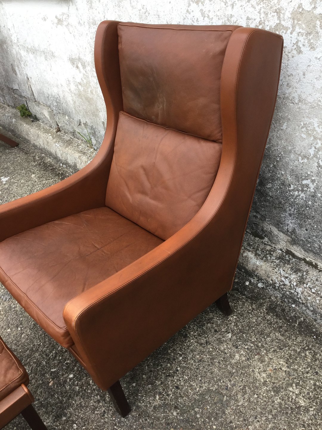 lænestol i læder med fodskammel. Fra ca. 1970, Stolen er med patineret læder / Brugsspor.