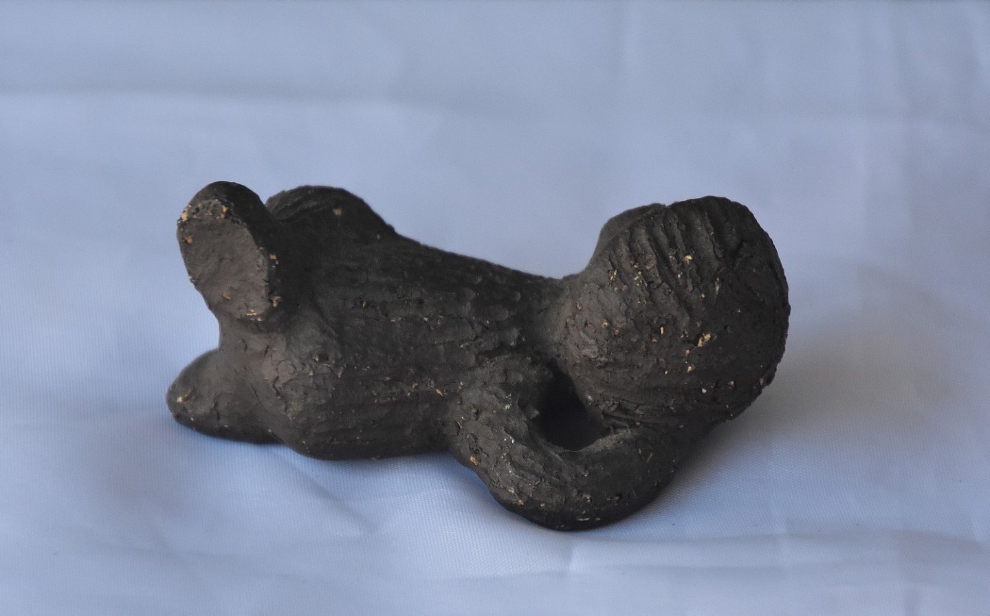 Troldefigur i keramik med motiv af troldpige, som ligger på ryggen