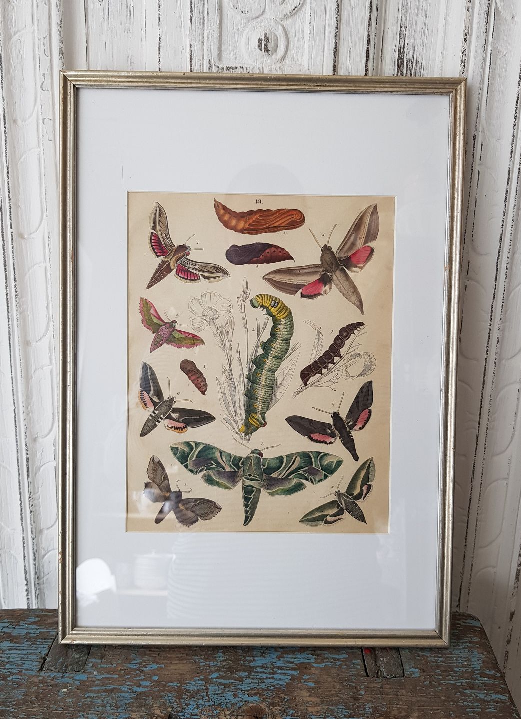 1800tals håndkoloreret tryk med sommerfugle i smuk enkel sølvramme.