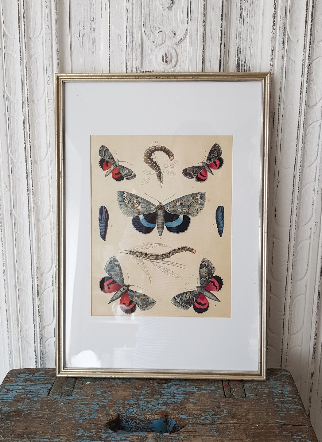 1800s hand-colored print with butterflies in a beautiful silver frame. Measure: 26.5 x 38 cm.