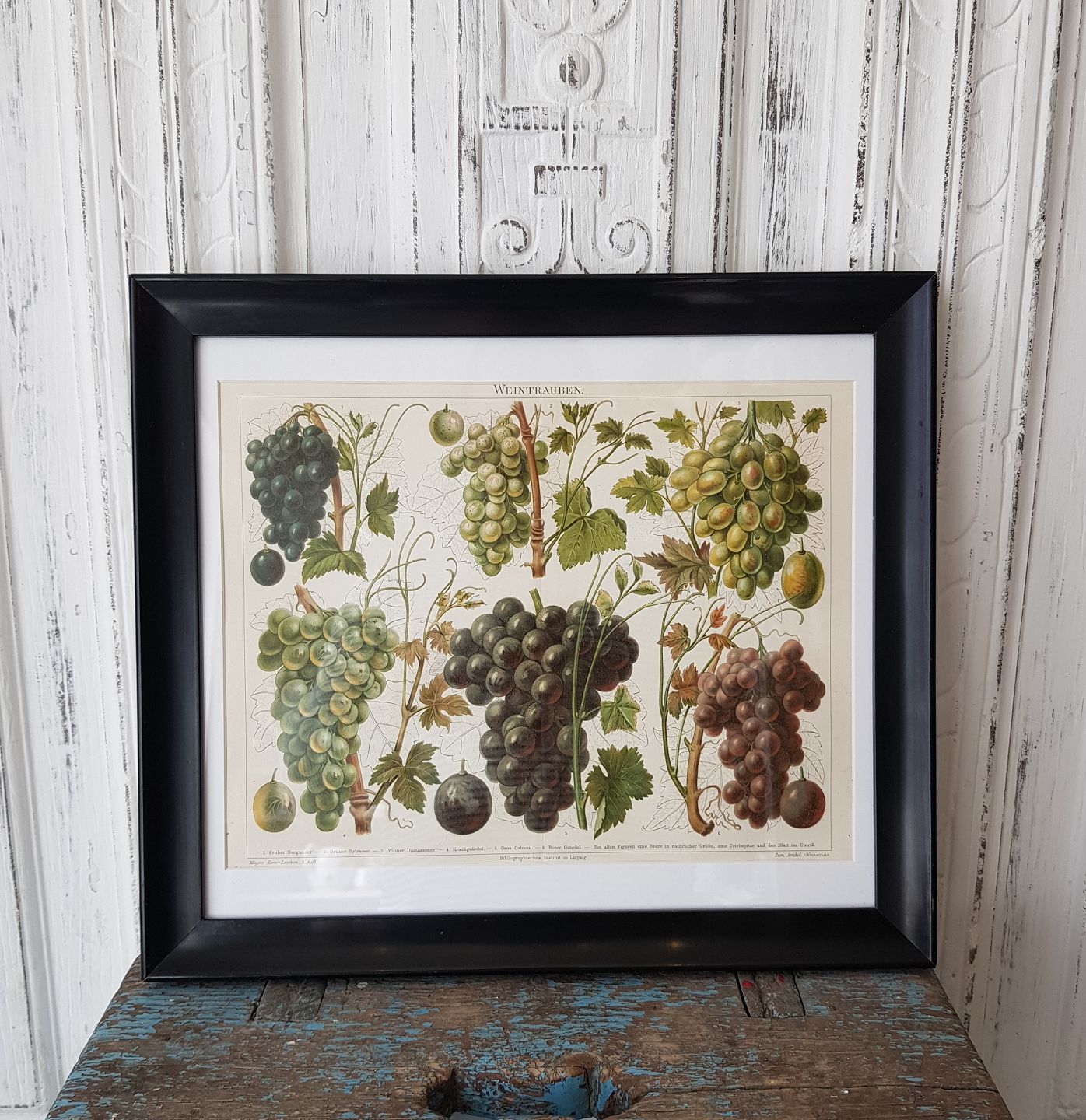 1800tals håndkoloreret tryk med vindruer i gammel sortlakeret ramme.