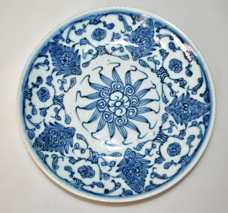 Blå/hvid kinesisk fad, 19. årh. Dekoreret med mønstre. Signeret. Dia.: 23,5 cm.