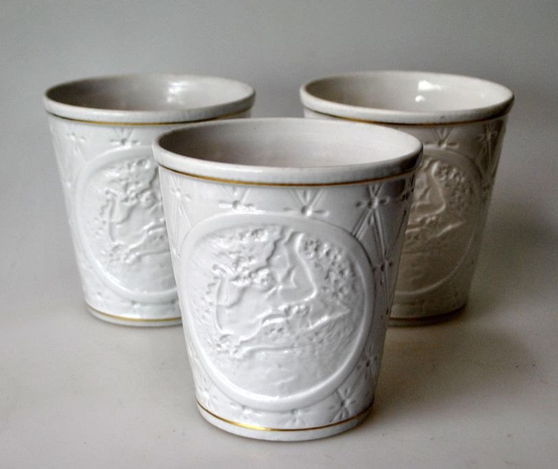 3 porcelain lamp screens, 20th century Germany. Conical. White porcelain with gilding. Relief with naked woman. H: 10 cm.
