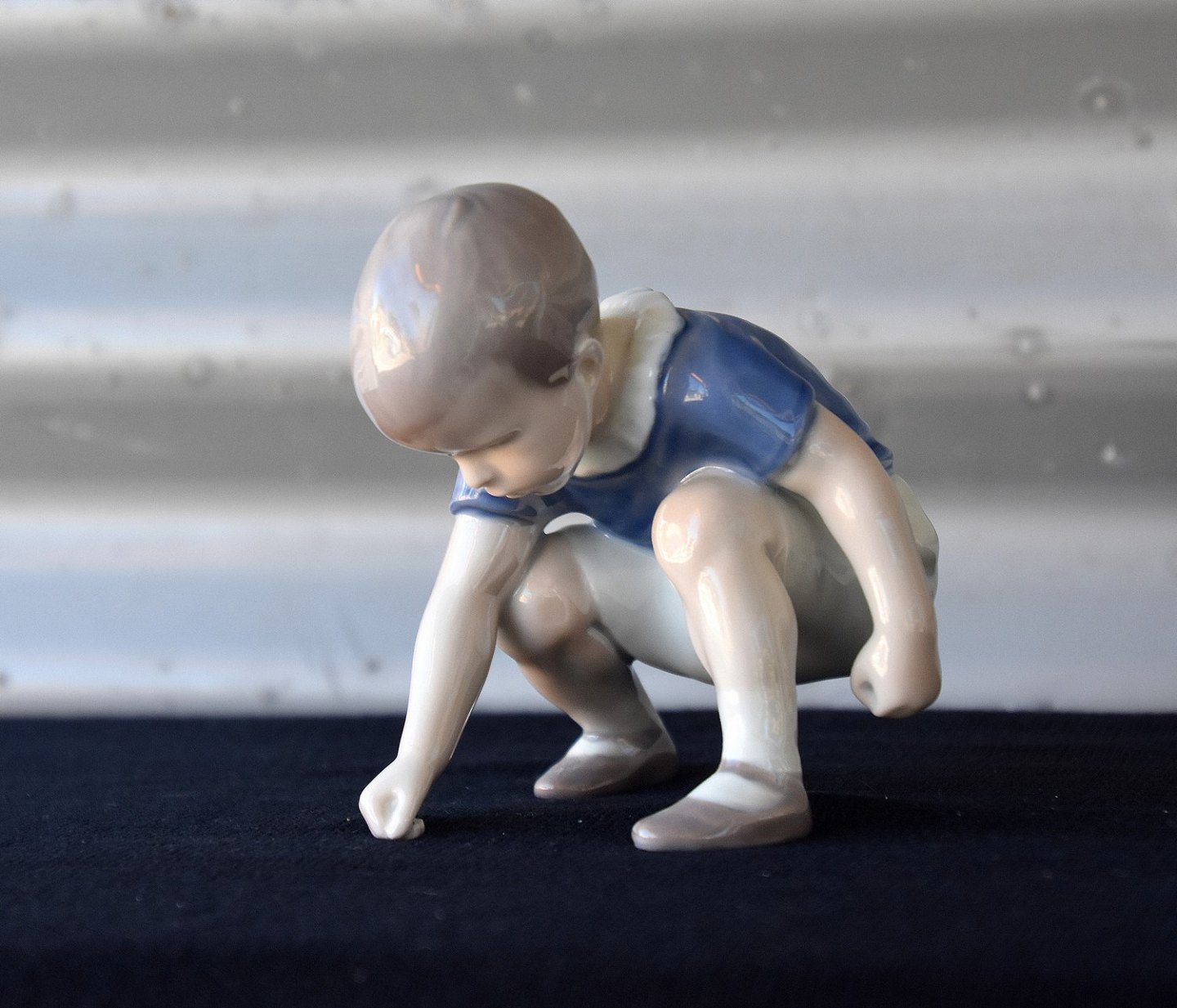 Figur i porcelæn med motiv af drengen Dickie siddende på hug. Nr. 1636 Drengen med gås.