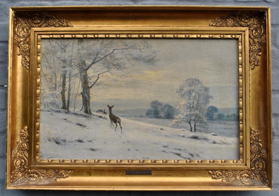 Jacobsen, A (19. årh.) Danmark: Rådyr i sne. Olie på lærred. Signeret. 36 x 59 cm.