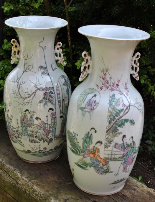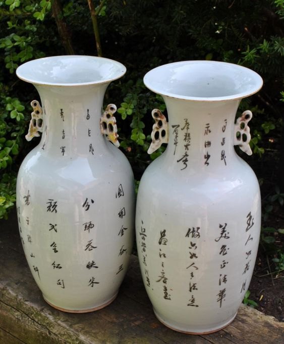 Pair of Chinese porcelain vases, 19/20. Hand-decorated, goldplated - decorated with women in garden and text. H: 43 cm.