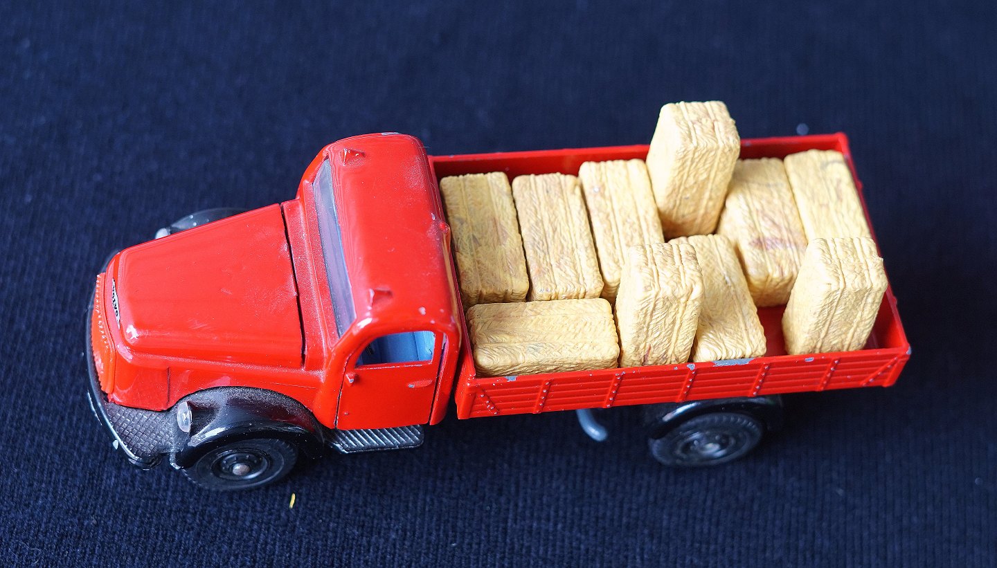 Volvo lastbil med anhænger og tilbehør i form af kornsække, mælkejunger og halmballer. Kølerhjelm på lastbilen kan åbnes