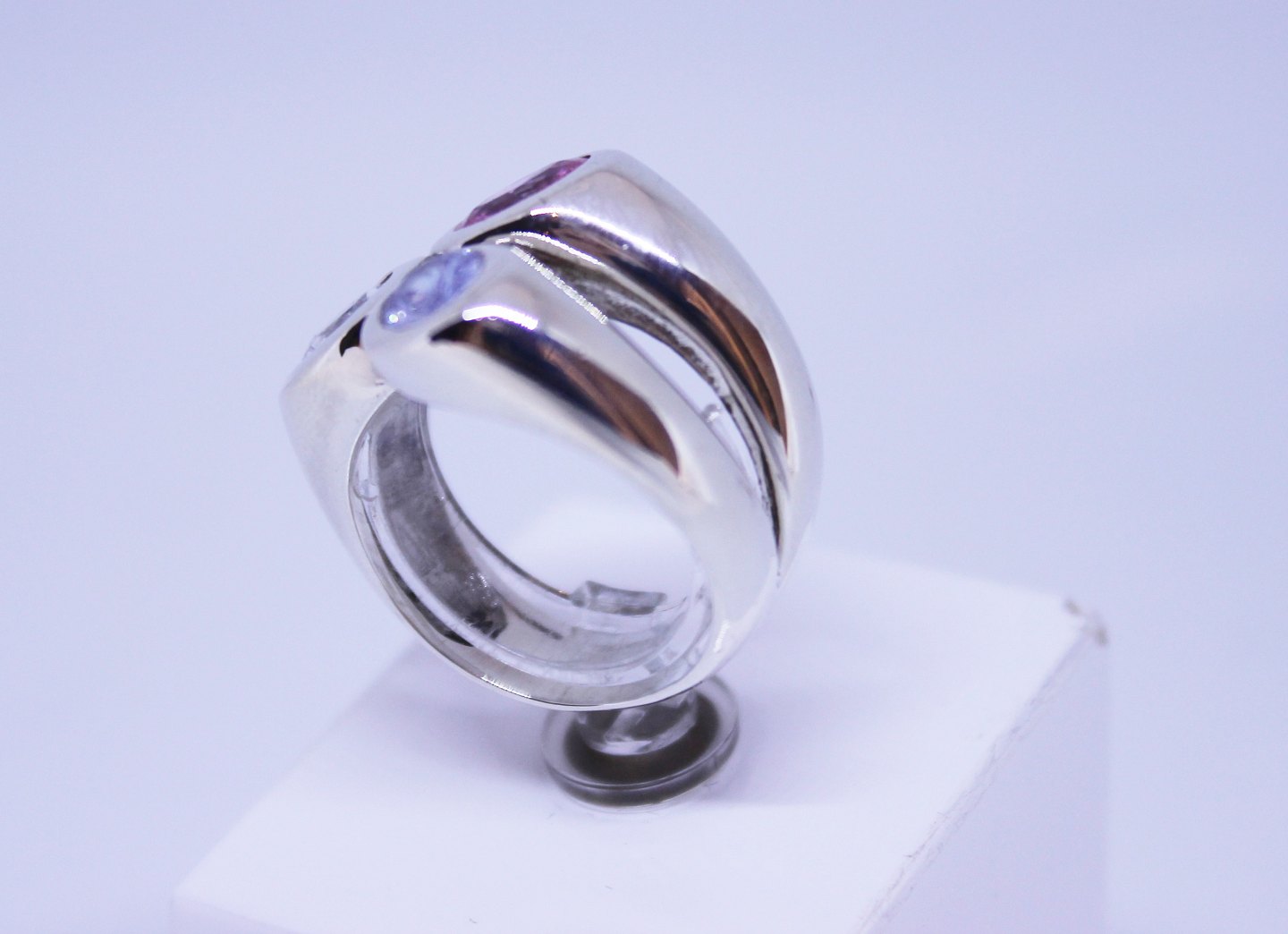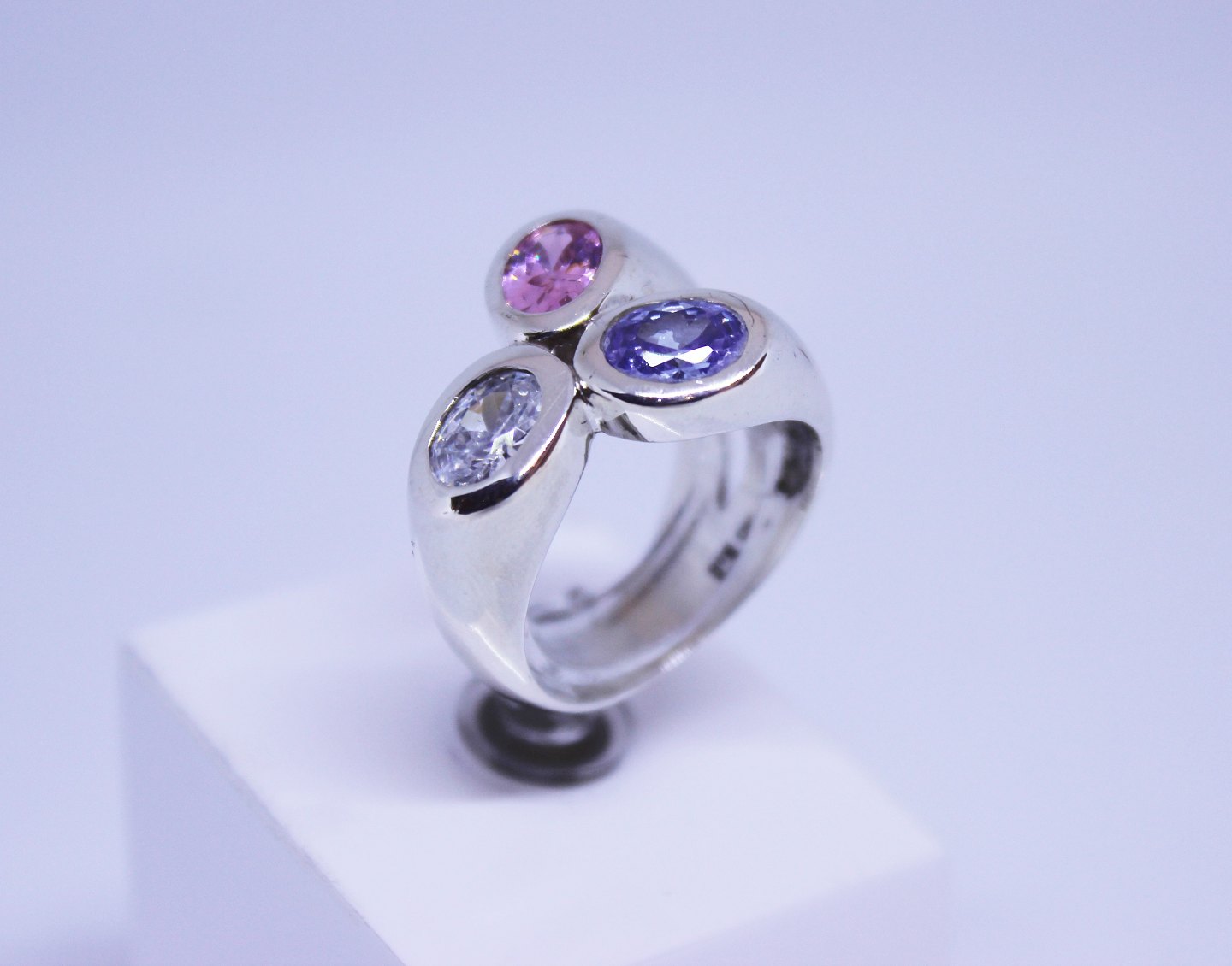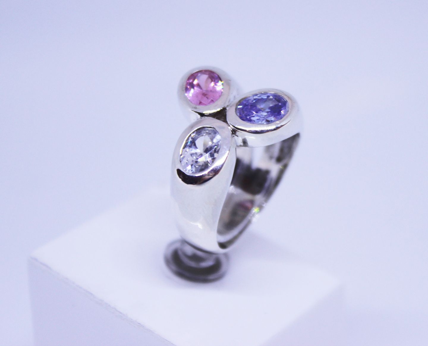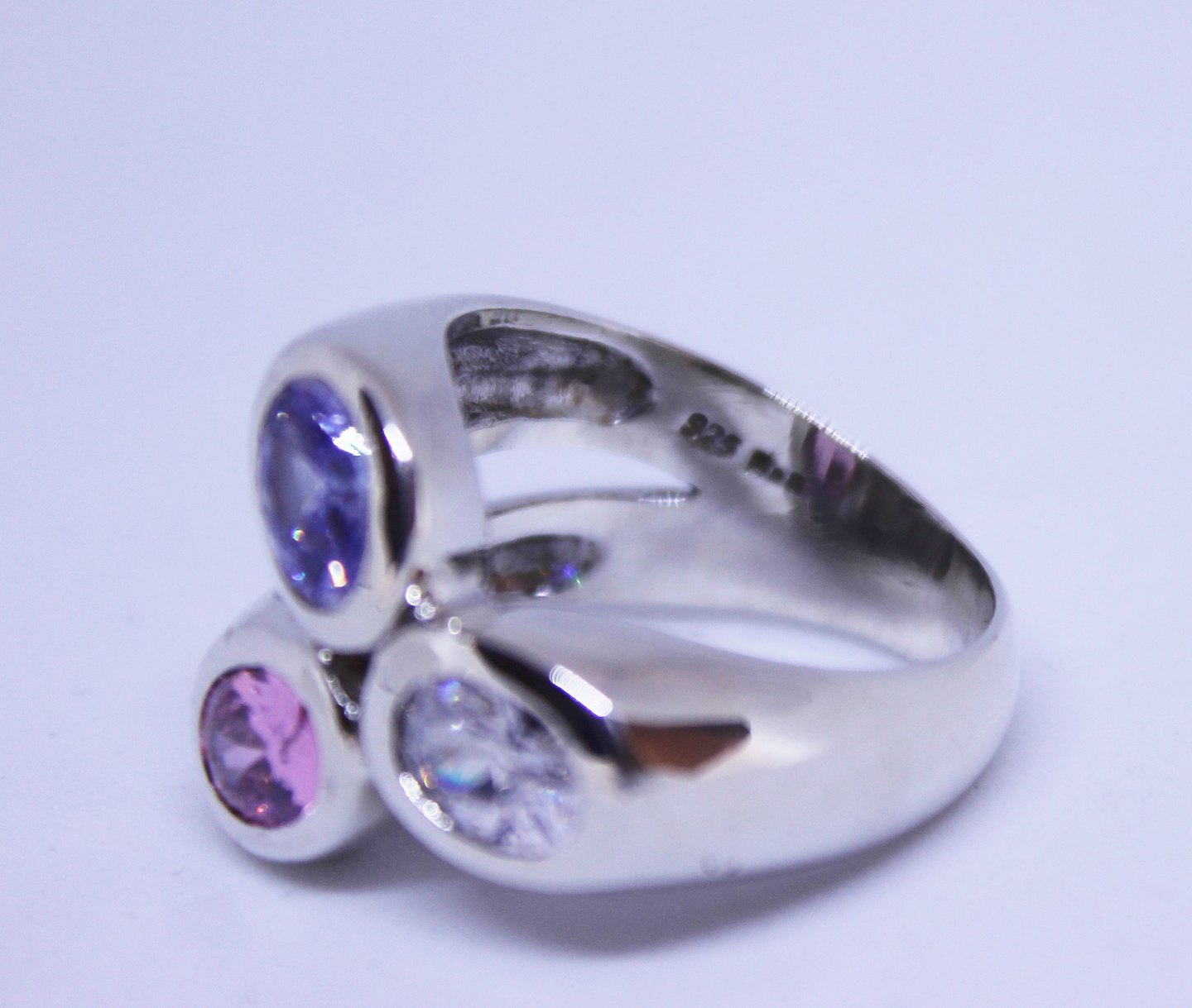 Large ring of 925 sterling silver with three synthetic stones in different light purple colours, stamped B&G.