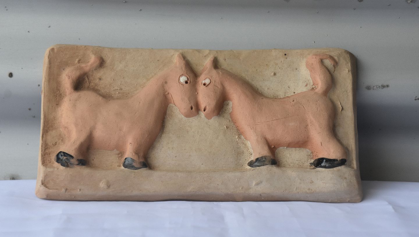 Relief, 2 heste, der står med mulerne mod hinanden. Kun brunlige farver