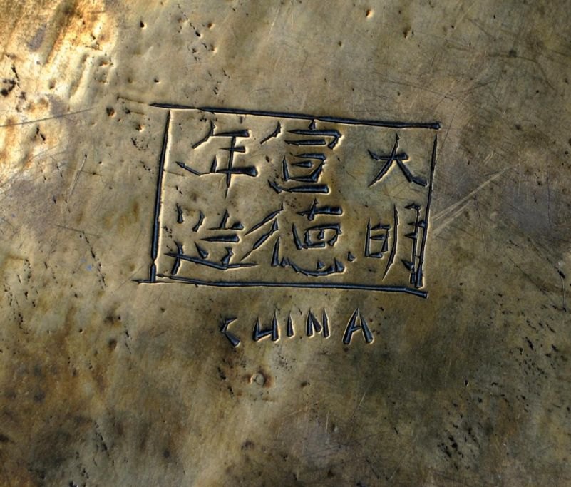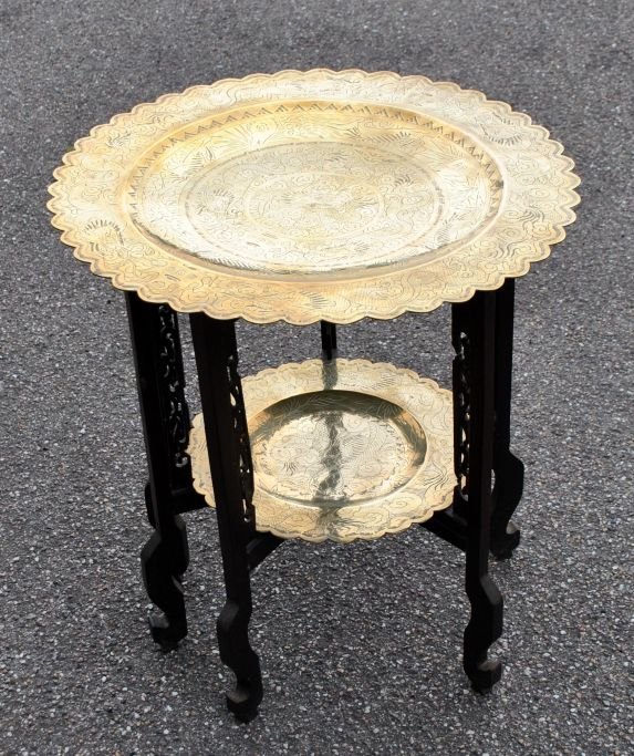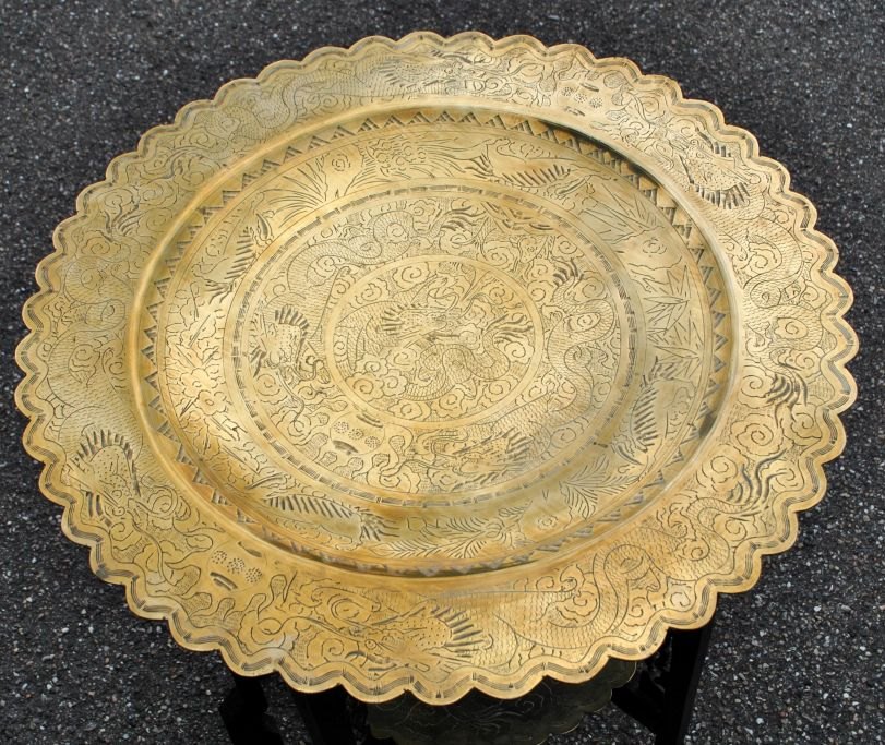 Chinese Smoking table, 19th century. Wooden frame with 6 carved legs. With two brass plates with wavy edge. Decorations in the form of dragons. Plate diameter: 56 cm. and 35 cm. Table height: 60 cm.