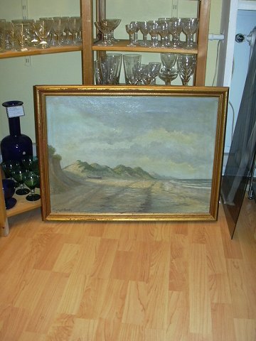 painting Beach with Boat in the dunes sign: Topkjær Olsen