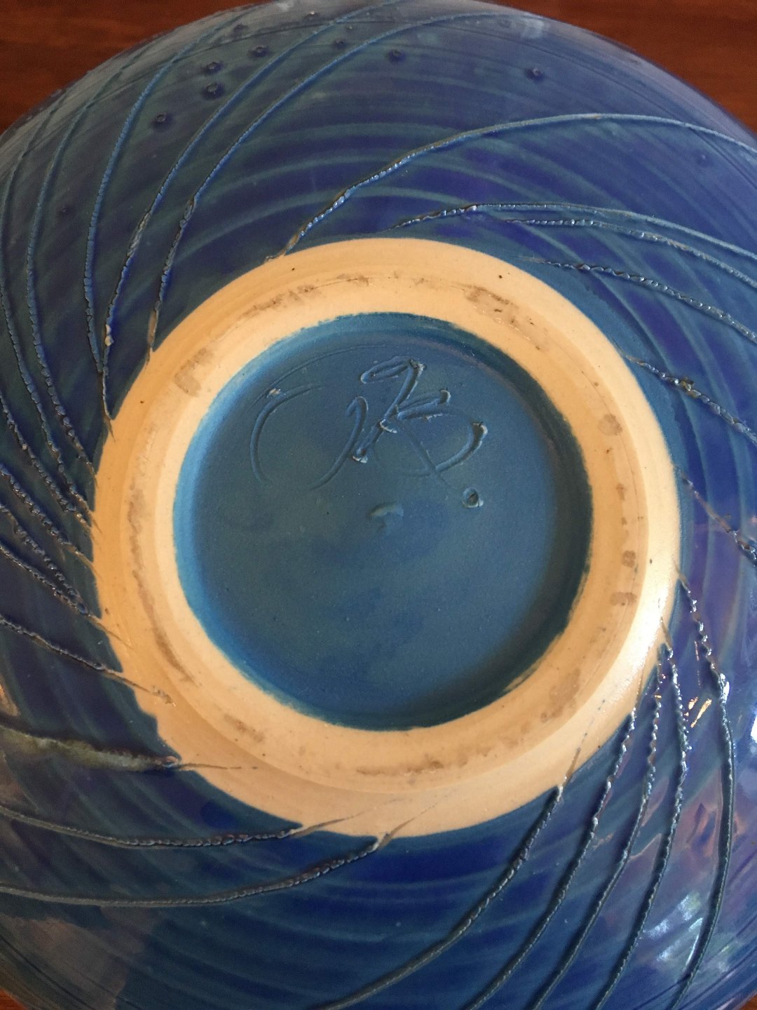 Skål i blåglaseret stentøj med indridsninger i skærven,