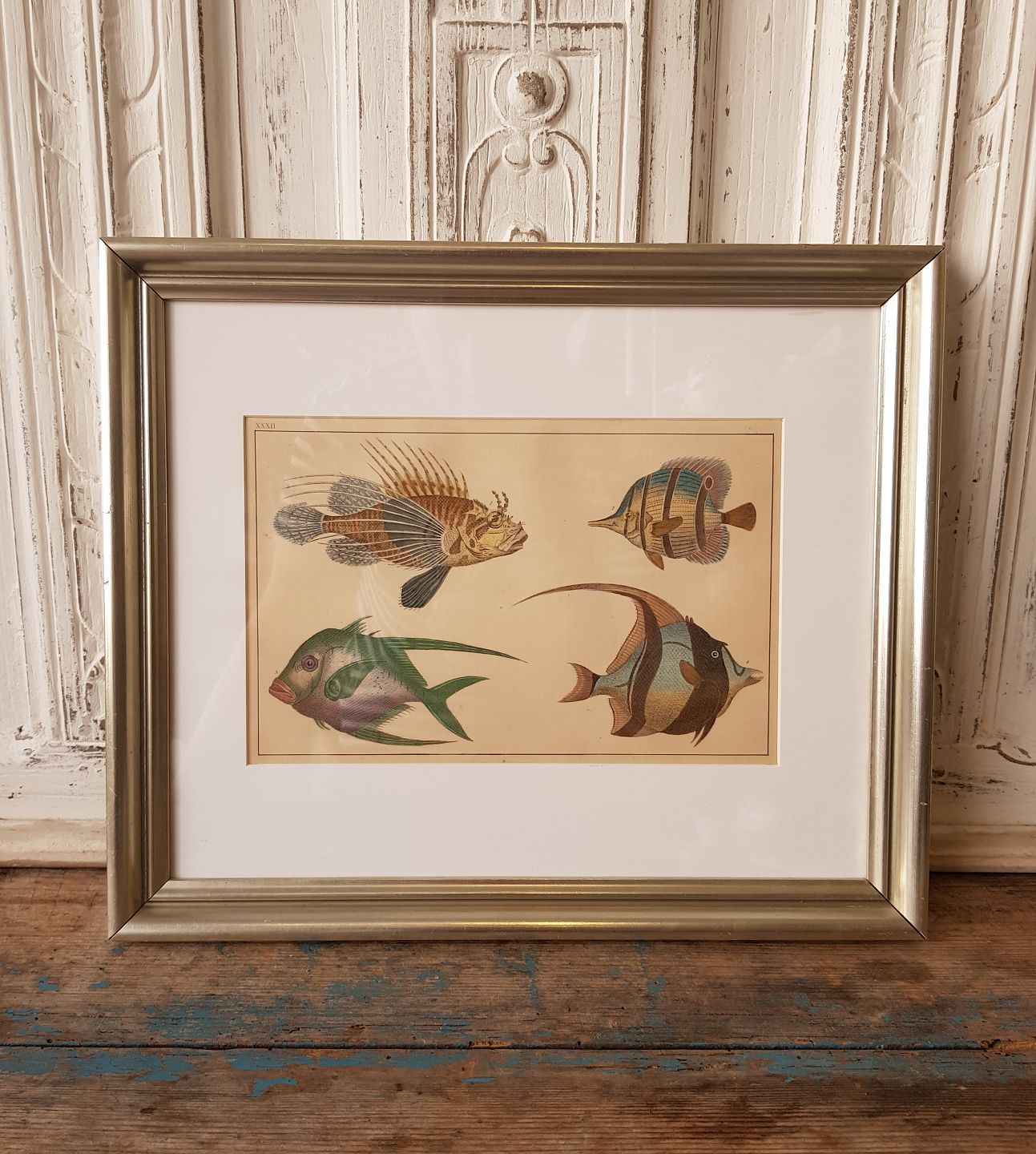 1800tals håndkoloreret tryk med tropiske fisk i smuk enkel sølvramme.