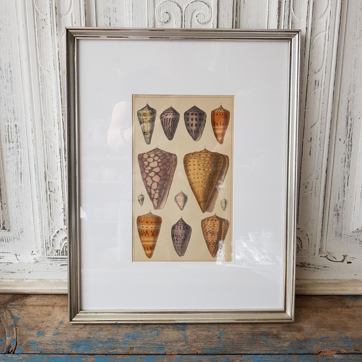 1800tals håndkoloreret tryk med konkylier i smuk enkel sølvramme