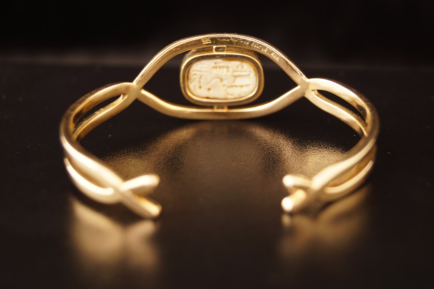 Hans Krüger; armring i 14 karat guld udskåret med en scarebæ. Fra København ca. 1980. L. 6,5 B. 5,5 cm.