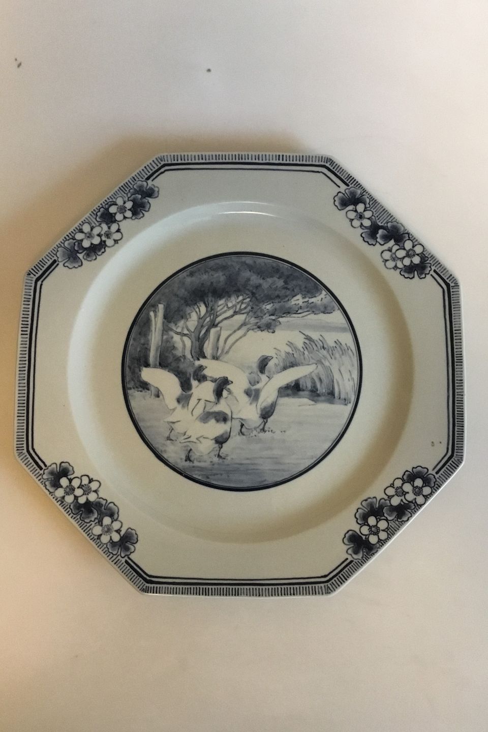 Royal Copenhagen Unique Faience octogonal Plate decorated with Geese. Gotfred Rode 4/6-1919. Measures 40 cm / 15 3/4 in. Minor Glaze fault