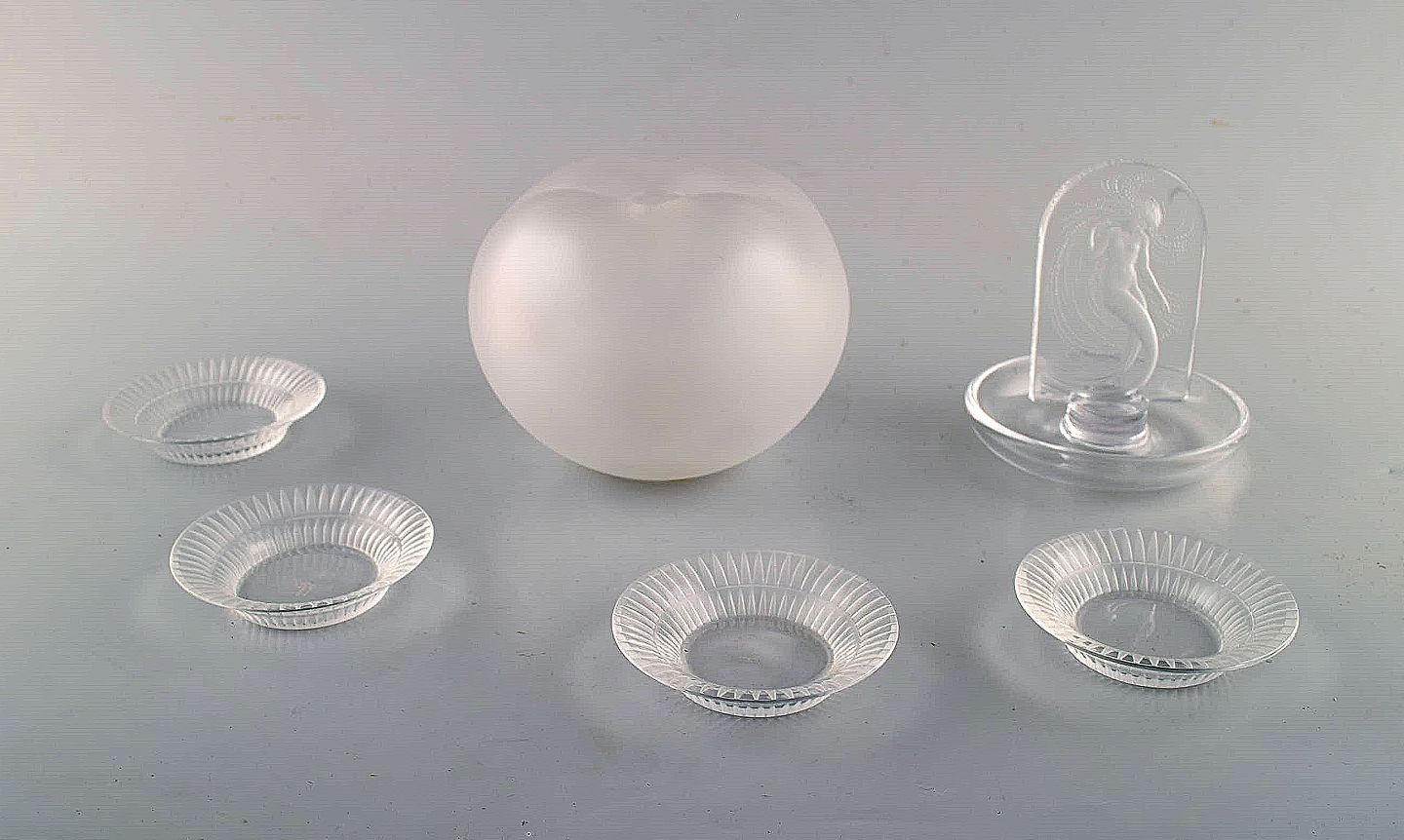 Lalique. Samling bestående af vase, smykkeskål og fire kaviarskåle. 1960'erne.