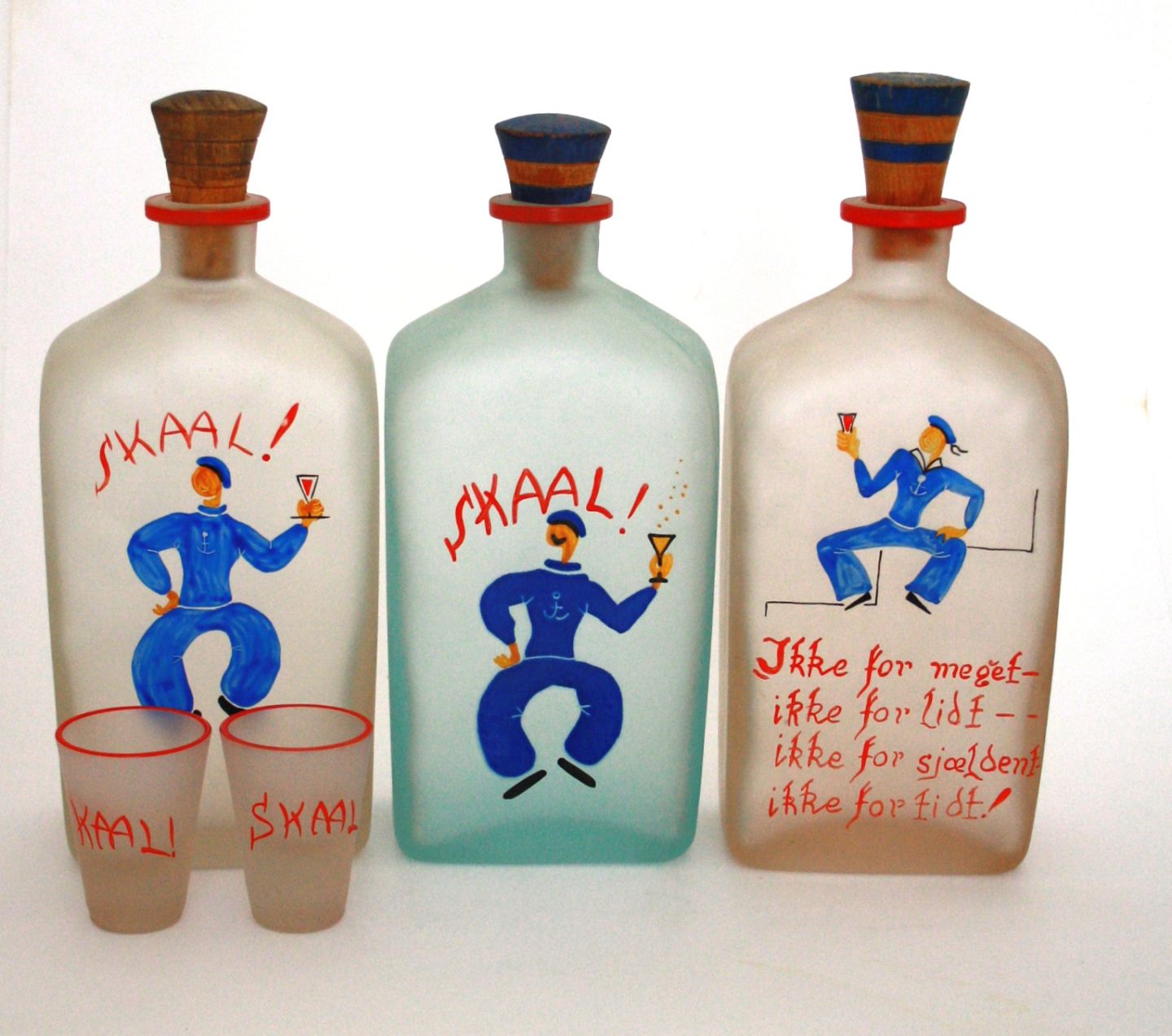 Tv. "Sømand med tekst SKAAL". Rødlig tone. Flaske med 2 glas. Pris: 525 kr. for sæt. Kantineflaske uden glas. Pris: 425 kr. stk. Lager: 1
