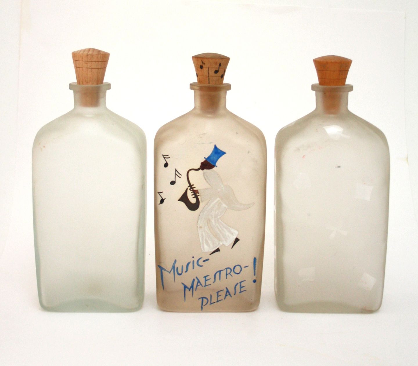 Midten. Flaske med jazzmusiker og noder på prop. Tekst "Music - Maestro - Please! Højde 22,5 cm. Pris: SOLGT