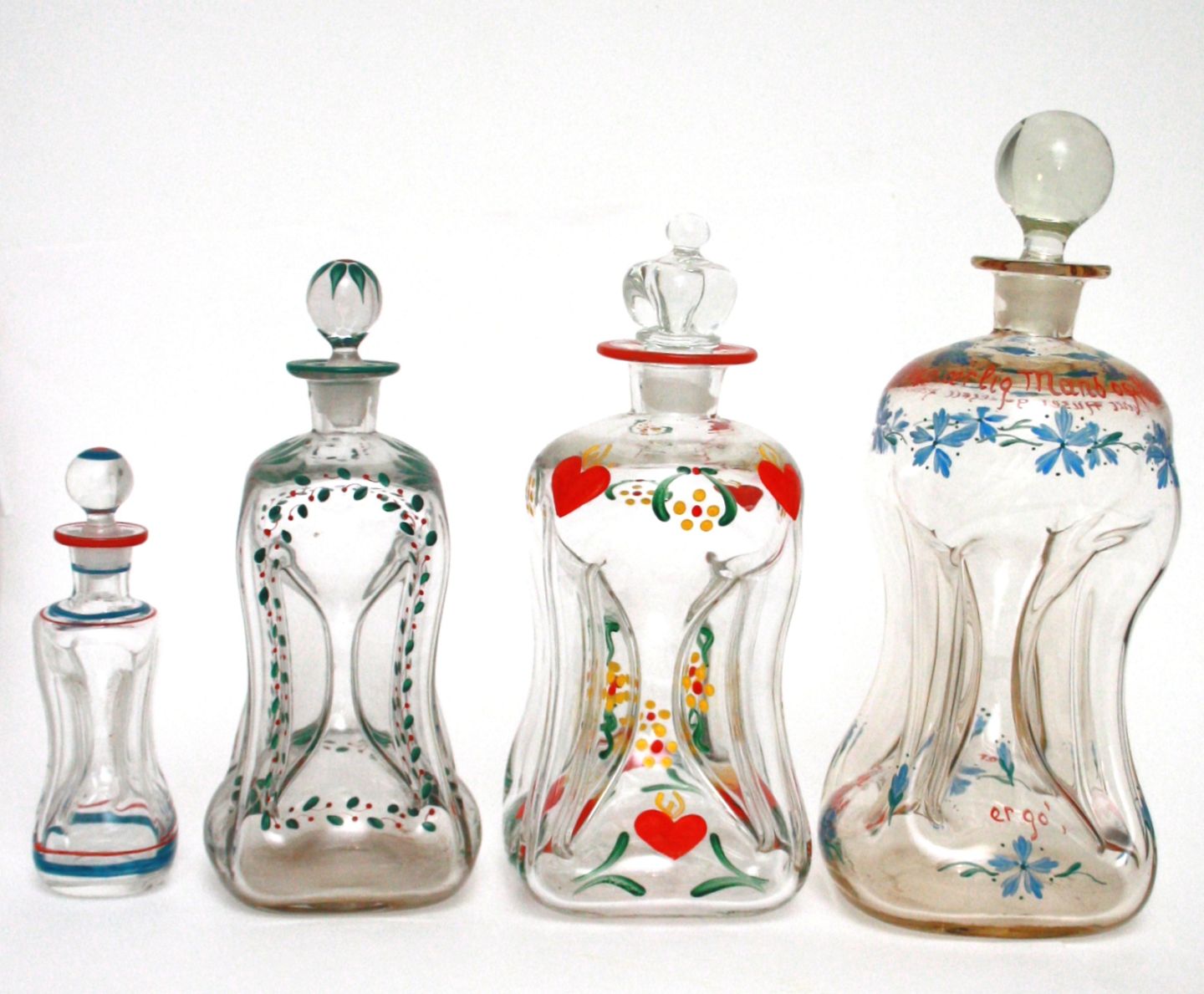 Text available in Danish: Holmegaard, Emaljedekorerede klukflasker designet af Jacob E Bang. Fra malerstuen i Nyhavn fra 1937-1957.