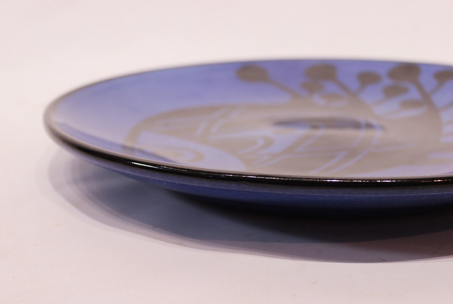 Large round ceramic dish with dark blue glaze and motif of a fish, by Pottemagerstuen at Graabrødretorv 1.