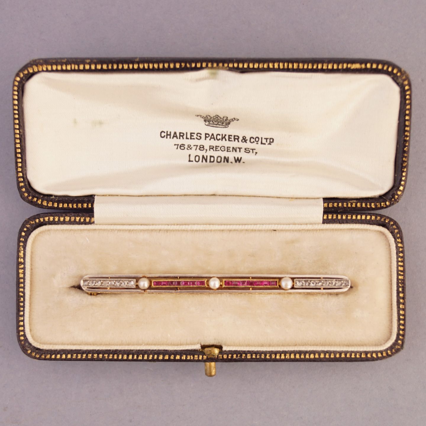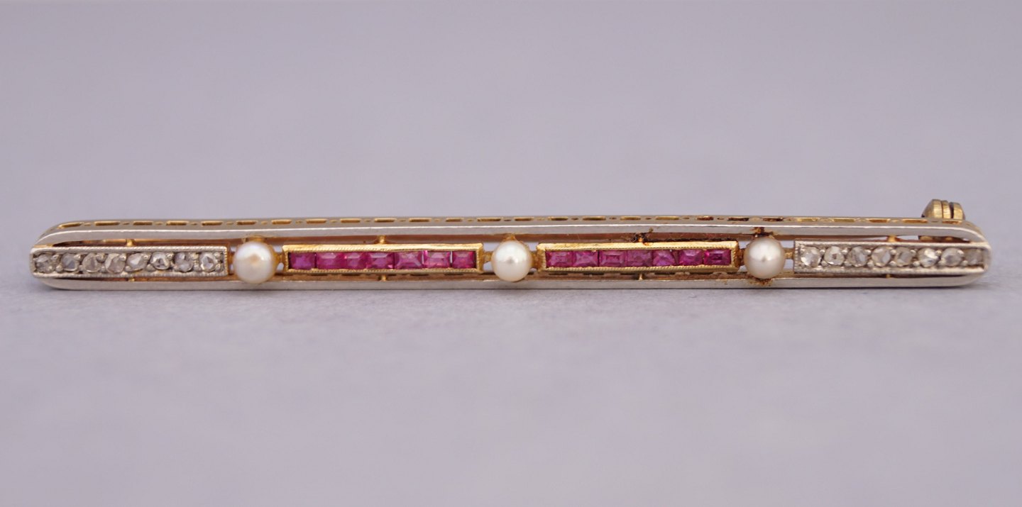 A brooch in 14k gold and white gold set with diamonds, rubies and perls