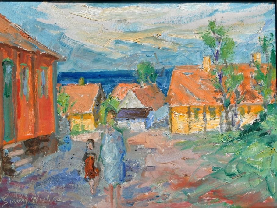 Nielsen, Svend (1908 - 1993) Danmark: En kvinde og et barn på en vej, Bornholm. Olie på lærred. Signeret.: Svend Nielsen. 30 x 40 cm.
