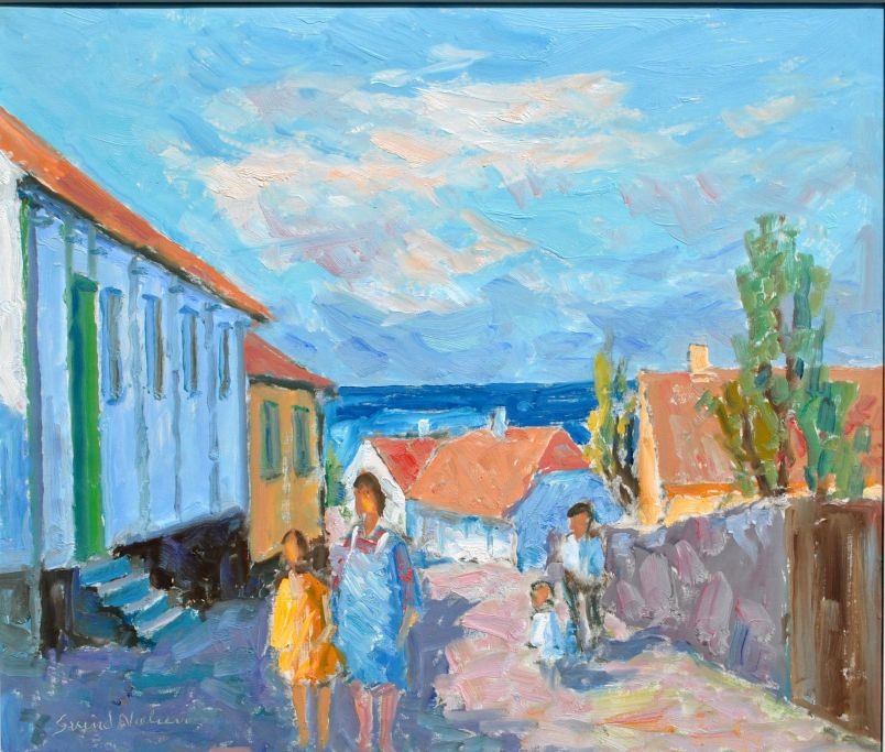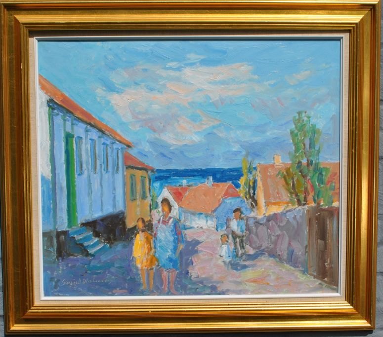 Nielsen, Svend (1908 - 1993) Danmark: Personer på en vej, Bornholm. Olie på lærred. Signeret. 60 x 70 cm.
