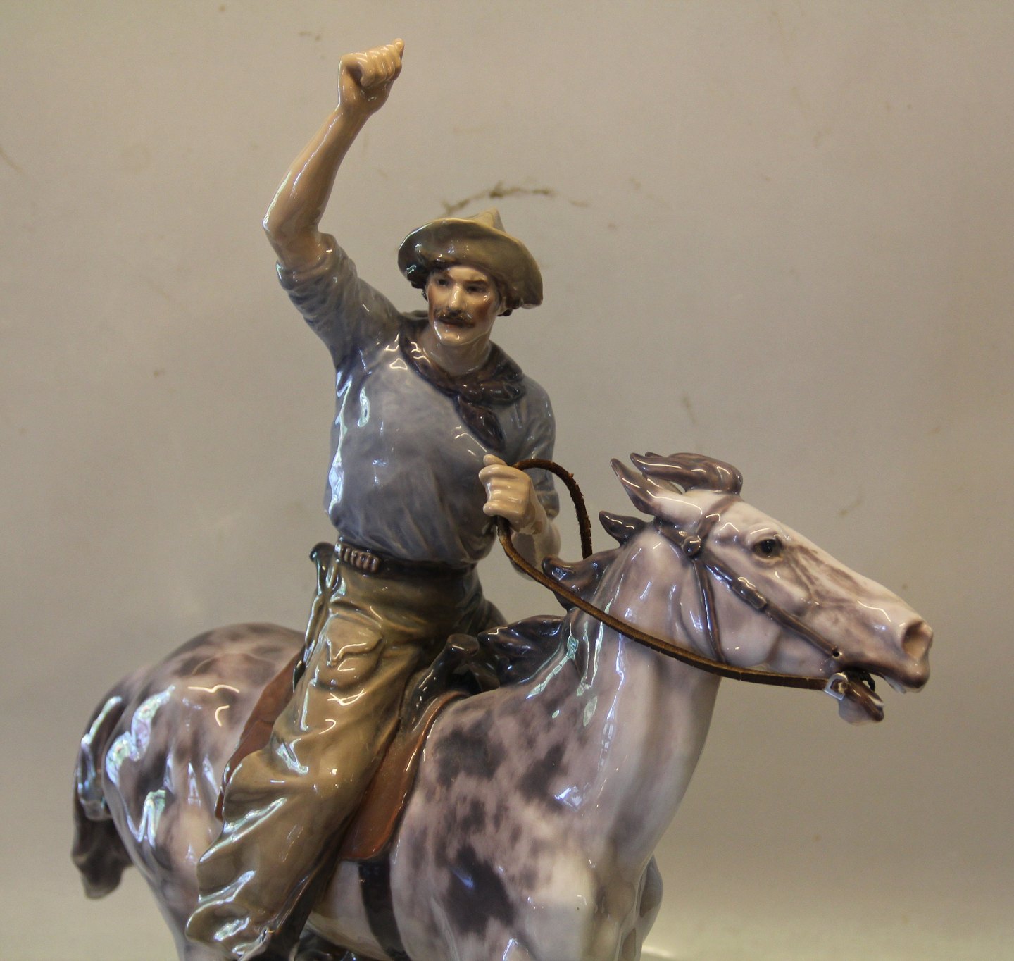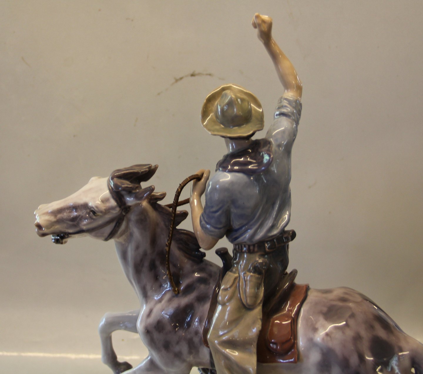Dahl Jensen 1266 Cowboy til hest 41,5 cm (LJ). Mærket med kongelig krone og DJ Copenhagen i hel og fin stand. Laurtiz Jensen 1859-1935