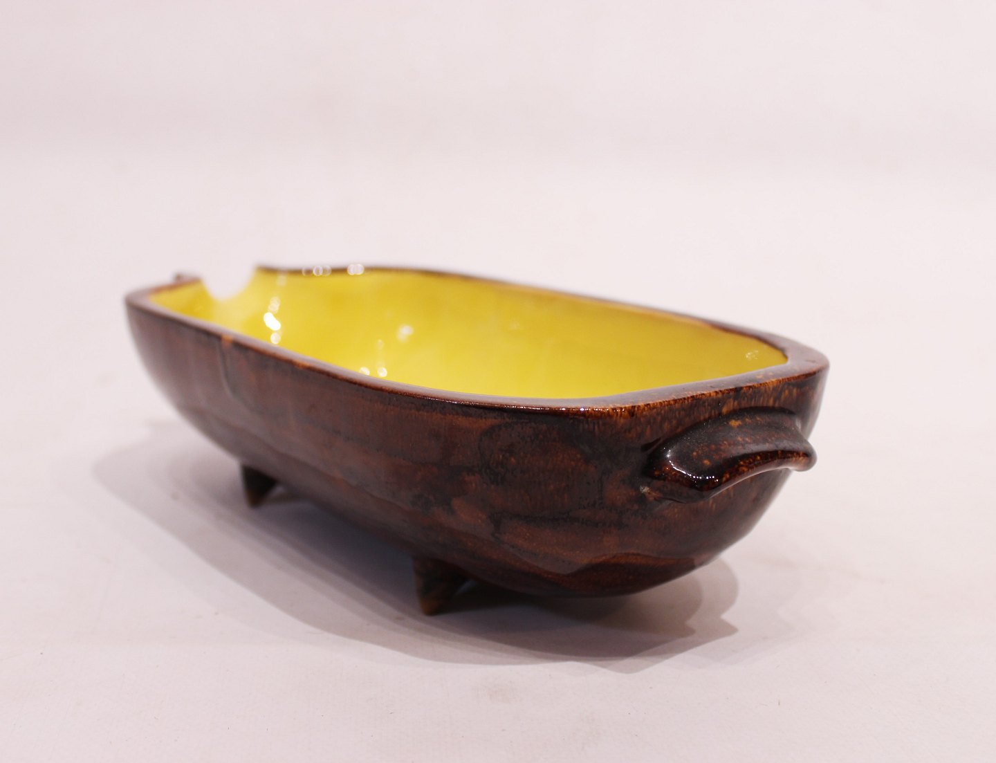 Keramik skål på fødder med brun glasur udvendig og gul indvendig, dansk design, 1960erne.
