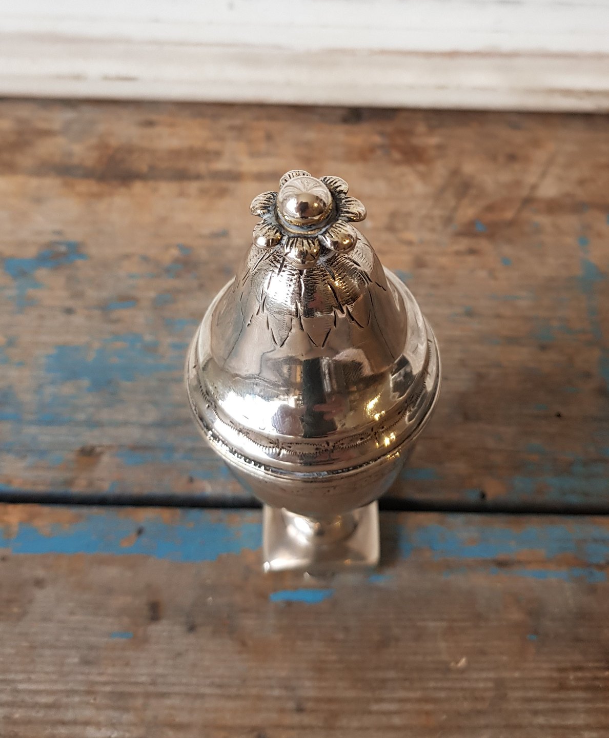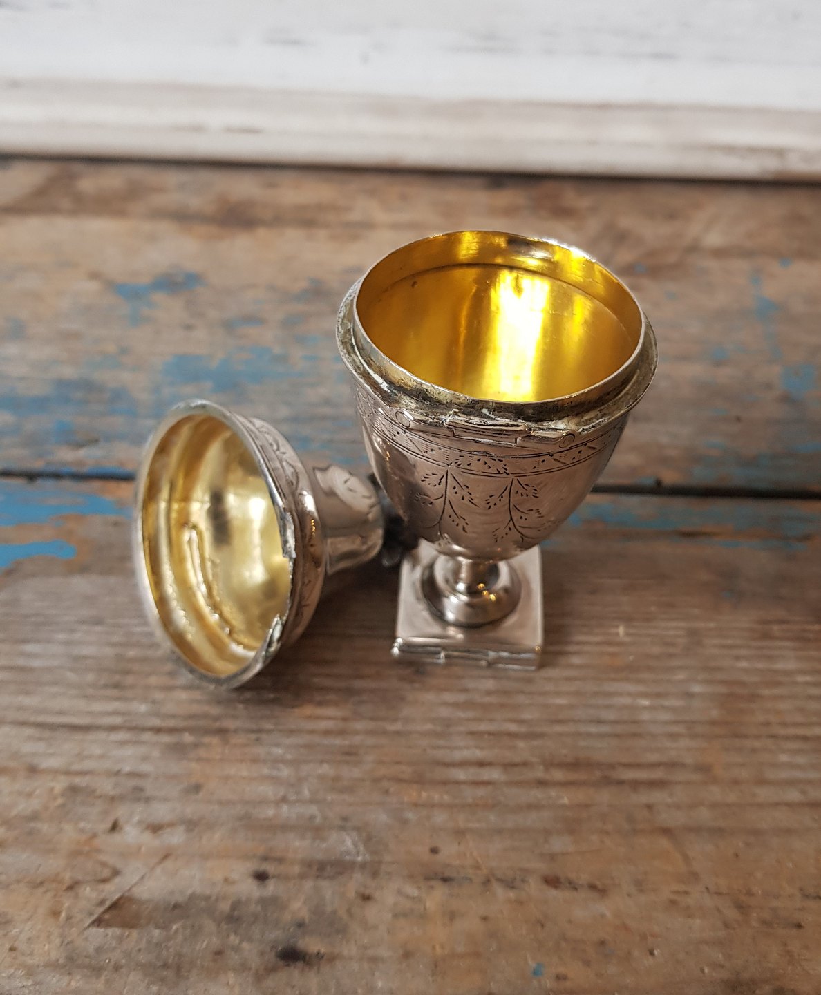 Text zugänglich auf Dänische: Hovedvandsæg i sølv indvendigt forgyldt, firkantet fod med gemme.