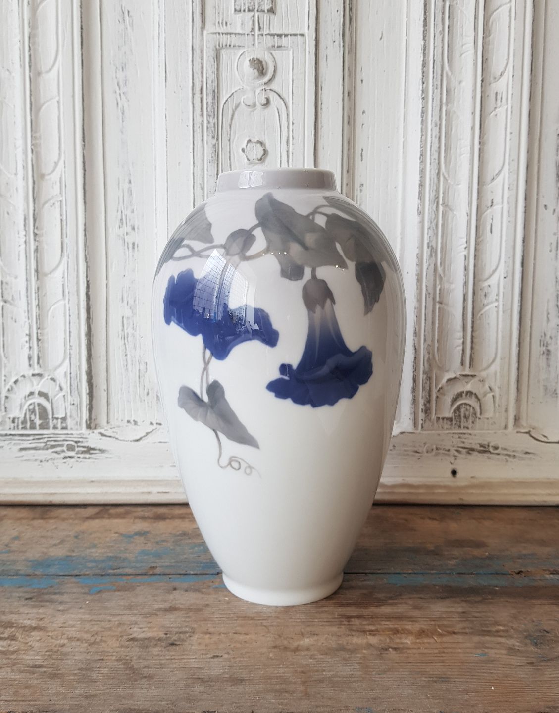 Royal Copenhagen Art Nouveau vase decorated with blue flowers.