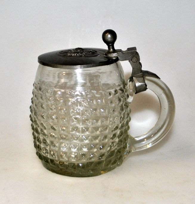 Tøndeformet drikke krus af fastblæst glas, 19. årh. Med tinlåg med gæk med dekorationer af roser og hank. H.: 10 cm.