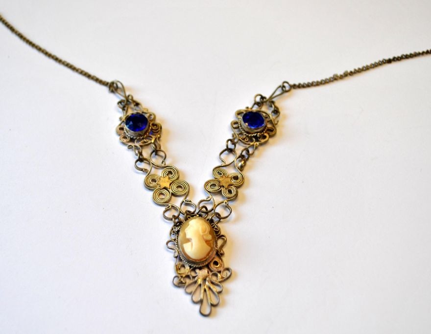 Norwegian necklace in filigree with glass and camè, 19/20. century.