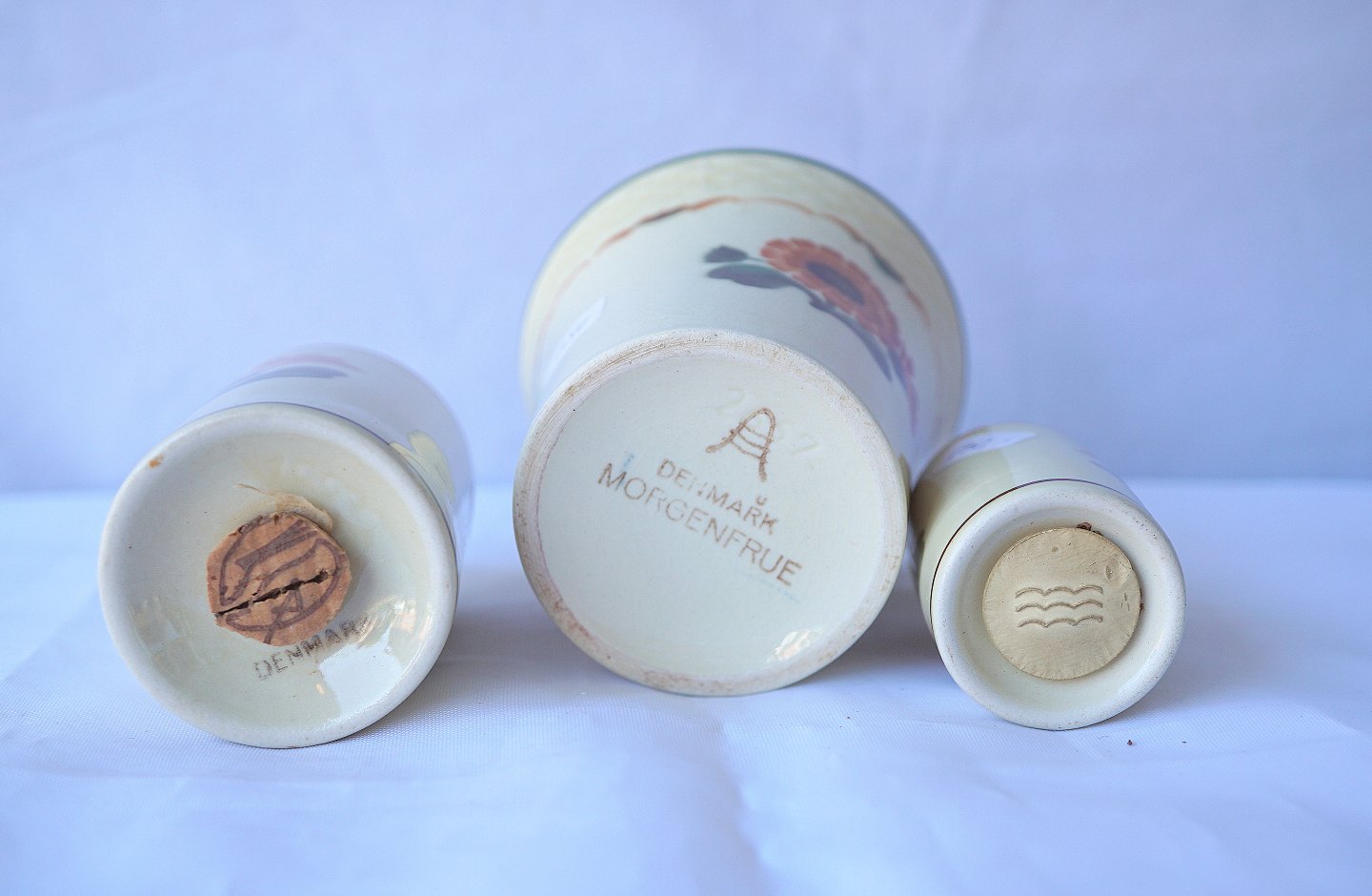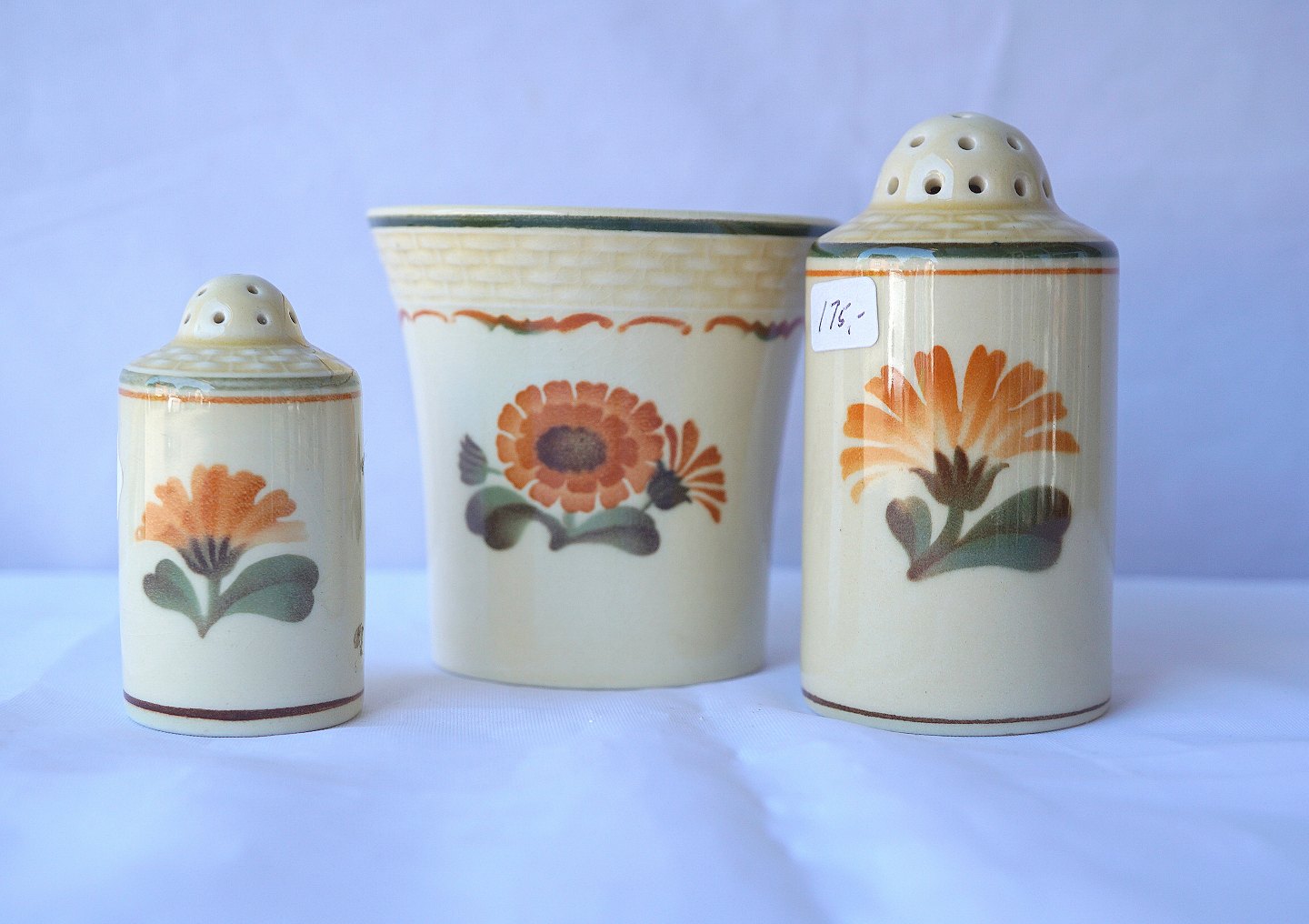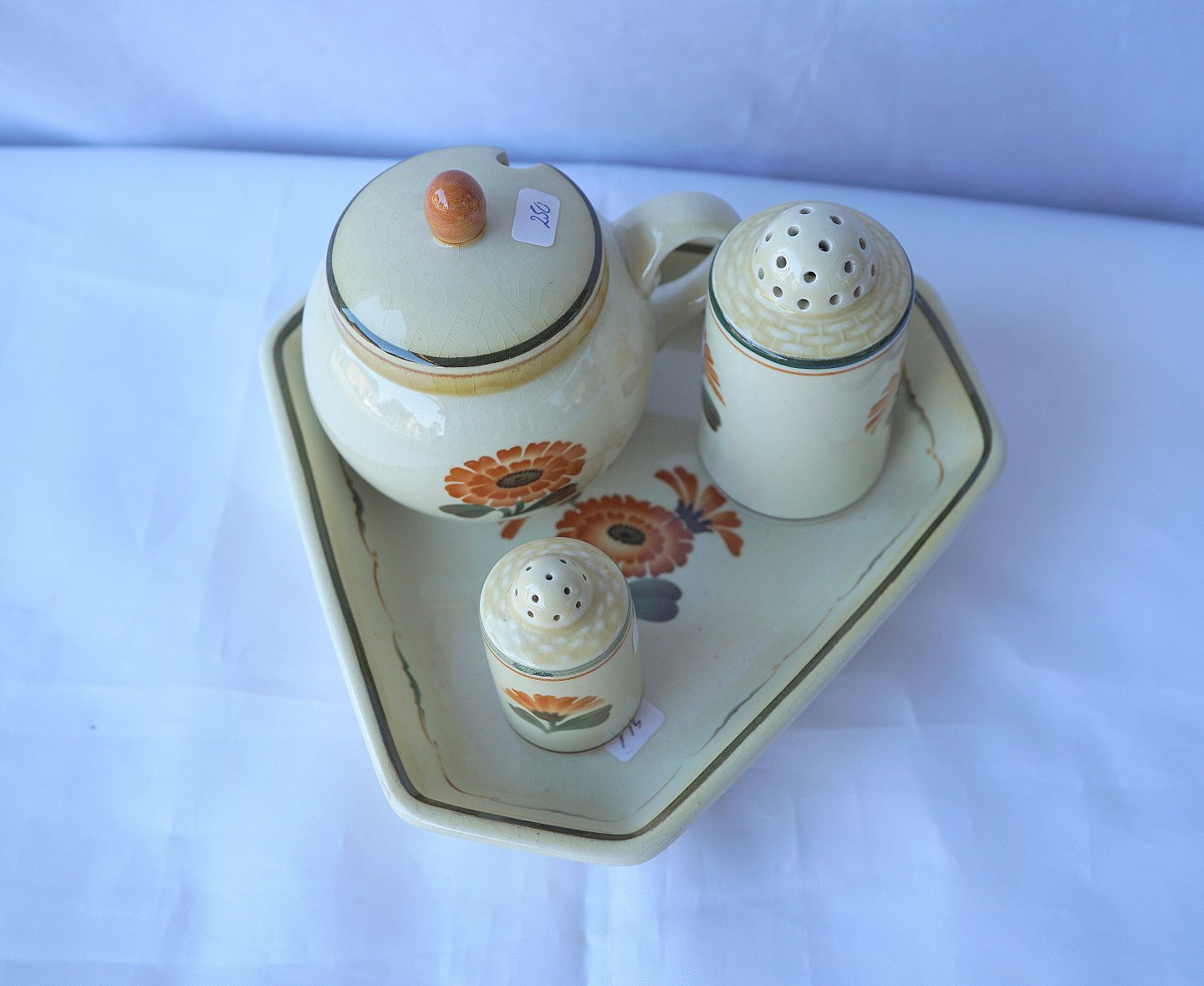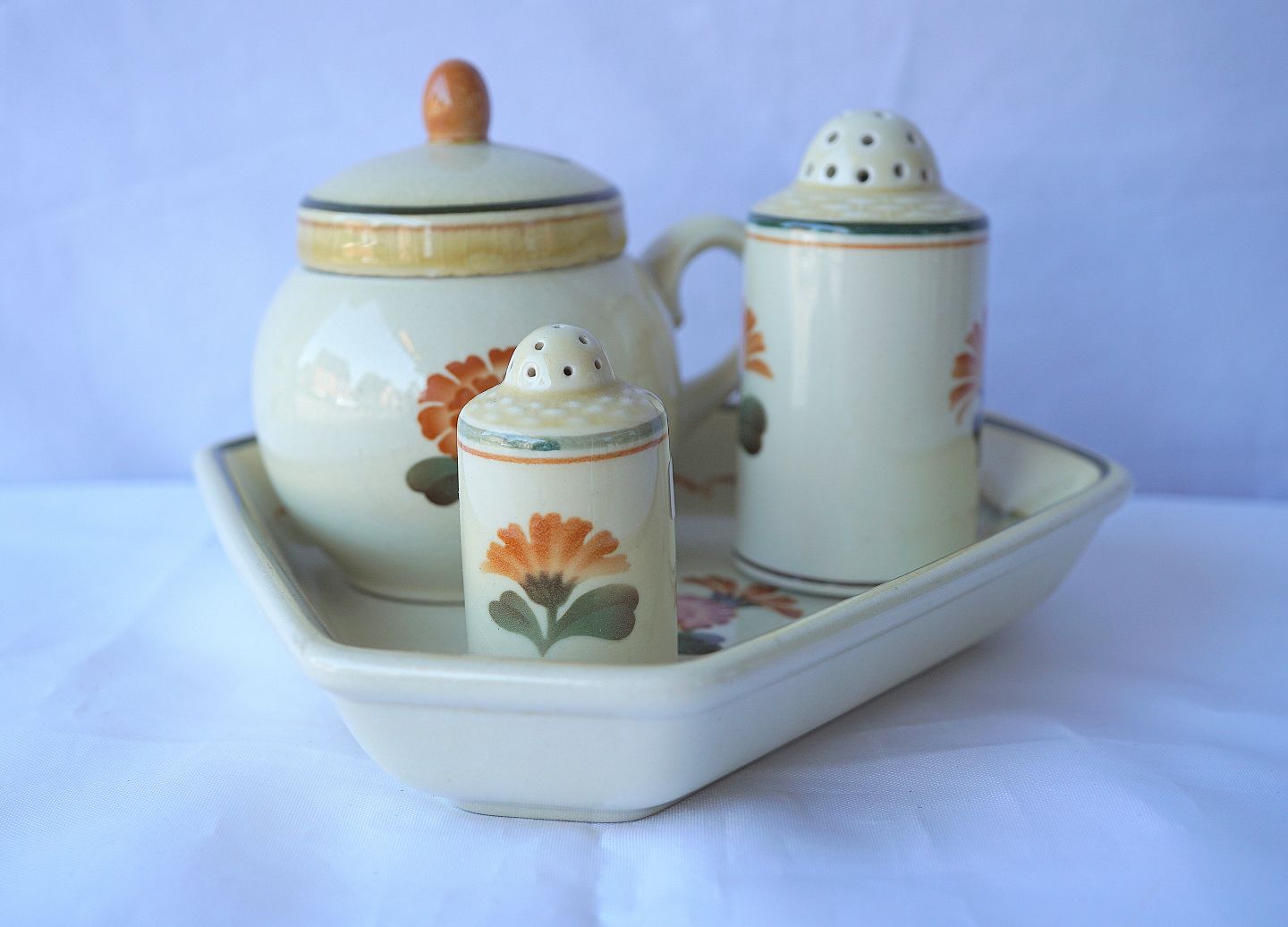 Text available in Danish: Aluminia. Morgenfrue Plat de menage bestående af sennepskrukke, salt- og peberbøsse.