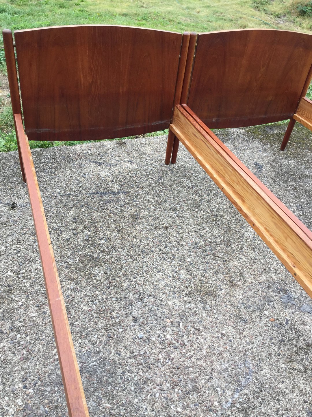 2 senge i teakfiner med høje gavle og afstandsstykker i messing. Fremstår uden bund. Udvendige mål (for en seng) 198x92 cm.