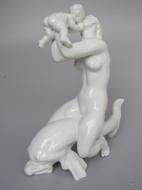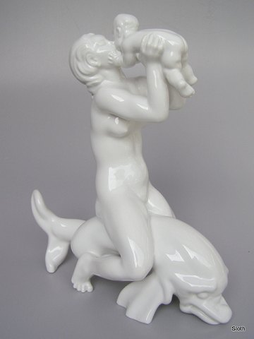 B&G Kaj Nielsen Blanc de Chine figur, Kvinde med Barn siddende på Delfin 1. sort. H: 39 cm.