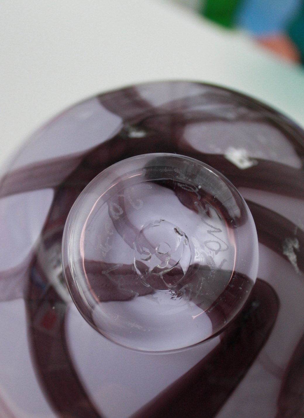 Th. Skål på fod i lys og mørklilla nuancer. Signeret Lena Pedersen 2003. Højde 10 cm. Øverste diameter 10 cm. Pris: 275 kr.