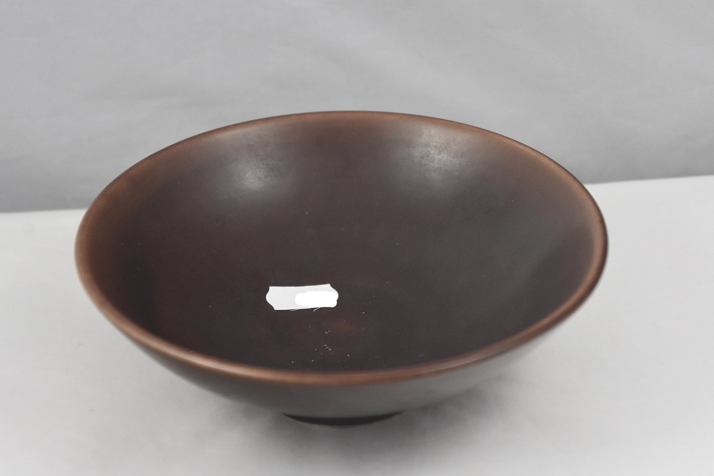 Brunlig glaseret skål på fod, harepelsglas lignende glassur