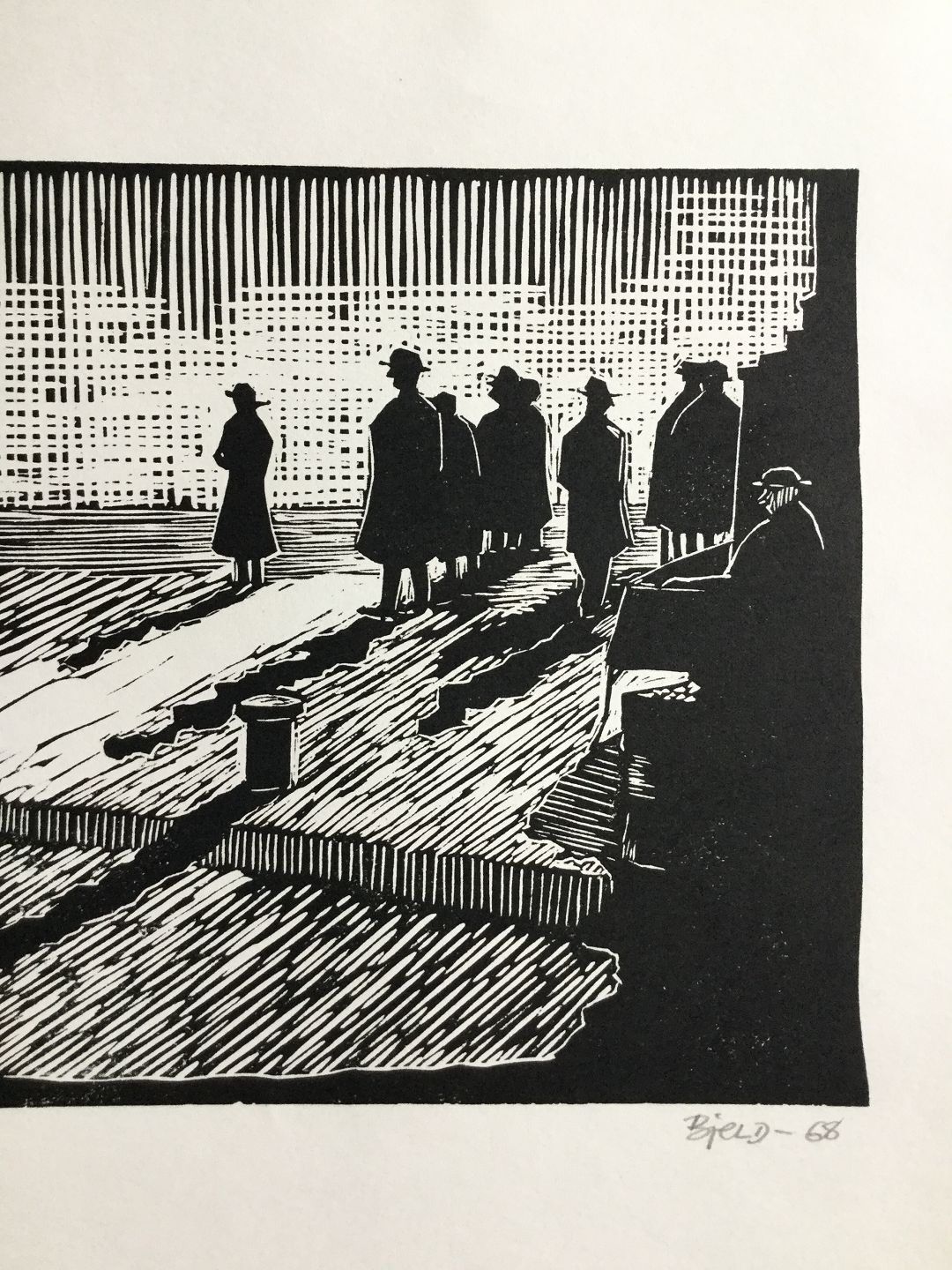 Linoleumssnit af Sigurd Bjeld 1968 - Ventende personer i exteriør.