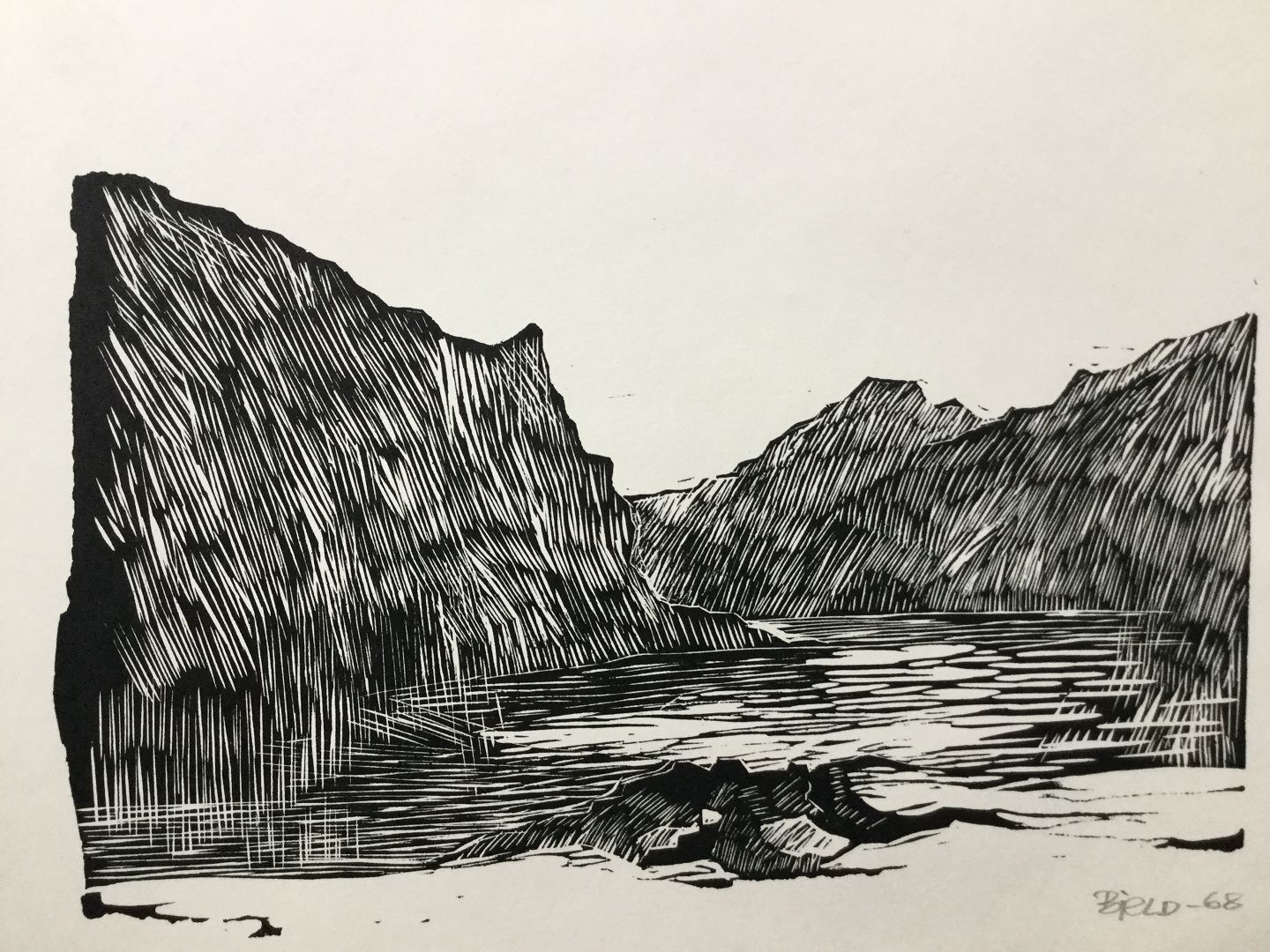 Linoleumssnit af Sigurd Bjeld 1968 - Bjerge ved indsejling.