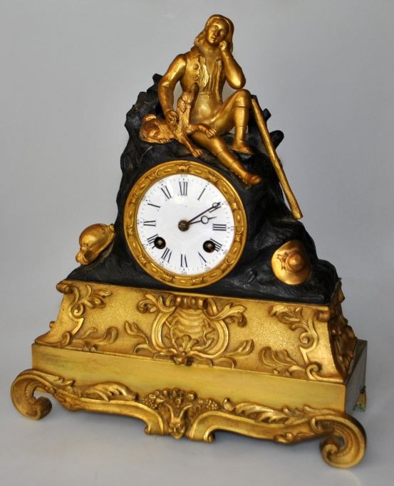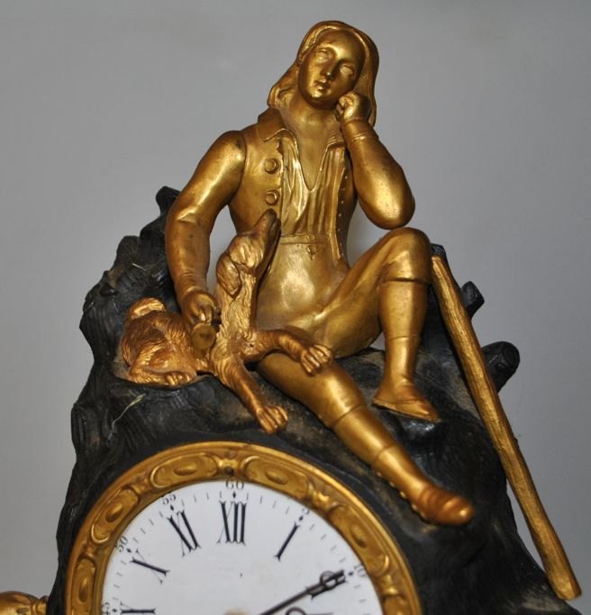 Fransk kaminur i forgyldt bronze, ca. 1830. Dekoration af ung vandrer med hund. Med mekanisk ophæng. H.: 32 cm. B.: 24,5 cm.