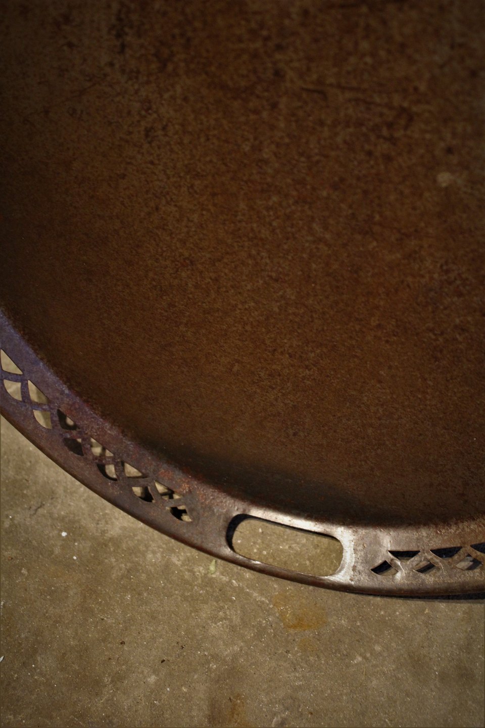 Old raw French oval tray in trimmed iron with hollow pattern along the edge.
