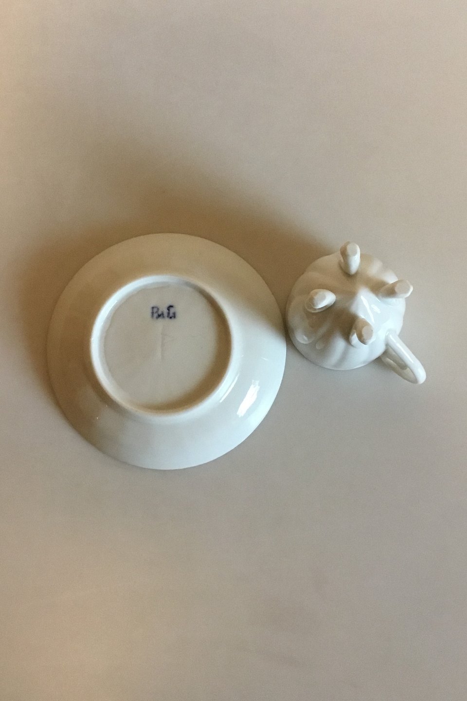 Bing & Grondahl Art Nouveau Mocha cup with saucer. Cup on four legs and inside with pink glaze. Measures Cup: 7 cm / 2 3/4 in. x 5.5 cm / 2 11/64 in. dia. Saucer: 12 cm / 4 23/32 in.