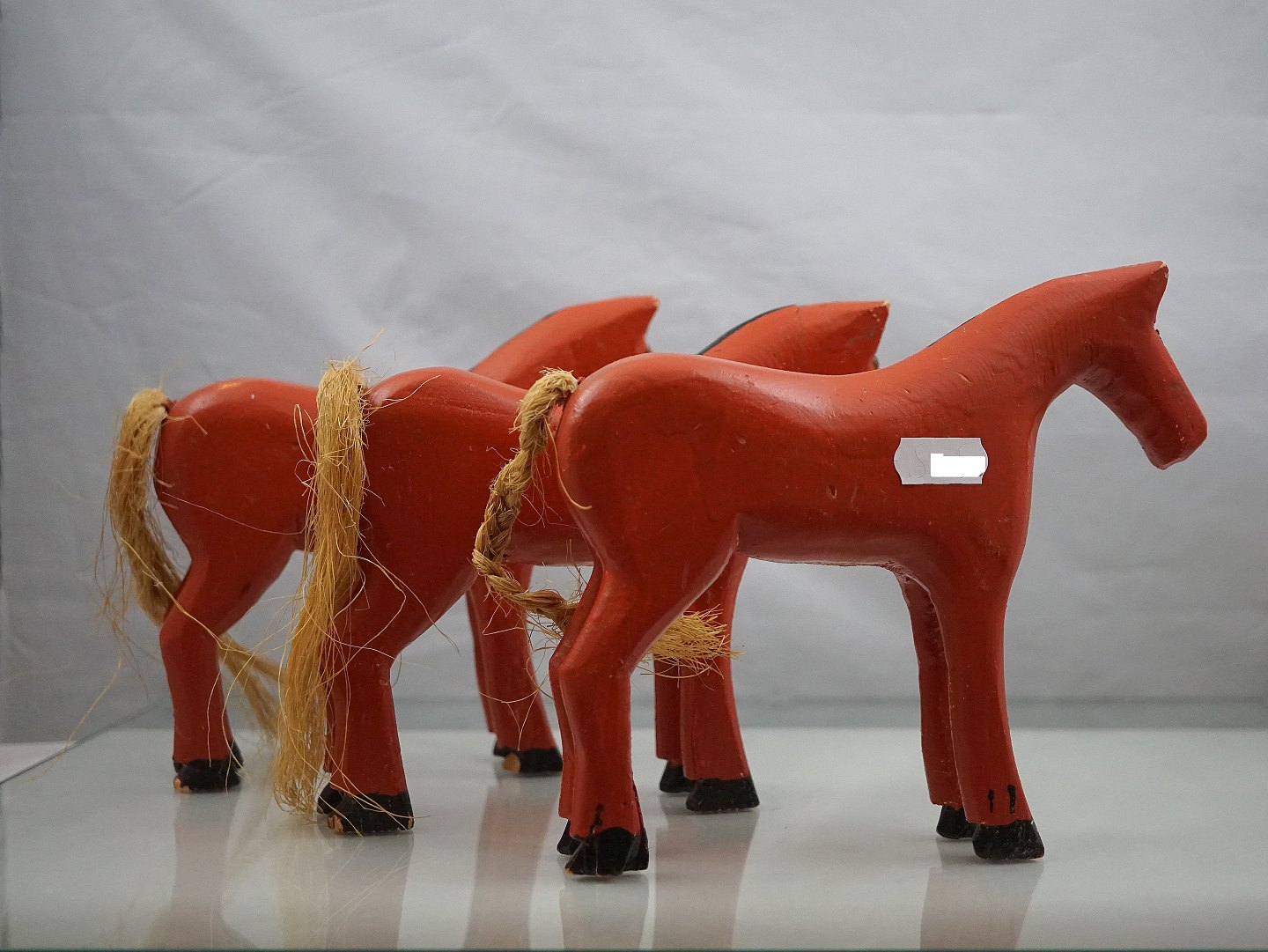 Text available in Danish: Gammelt legetøj, formodentligt fængselsheste. Hestene er udført i træ og rødmalet, dog er der kun malet sortmanke på de ene side. Halerne er lavet af reb