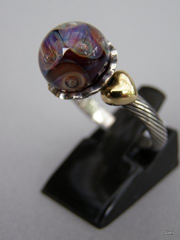 Sølvring 925 S. m. 750 Gukdhjerter og Flerfarvet Glasperle