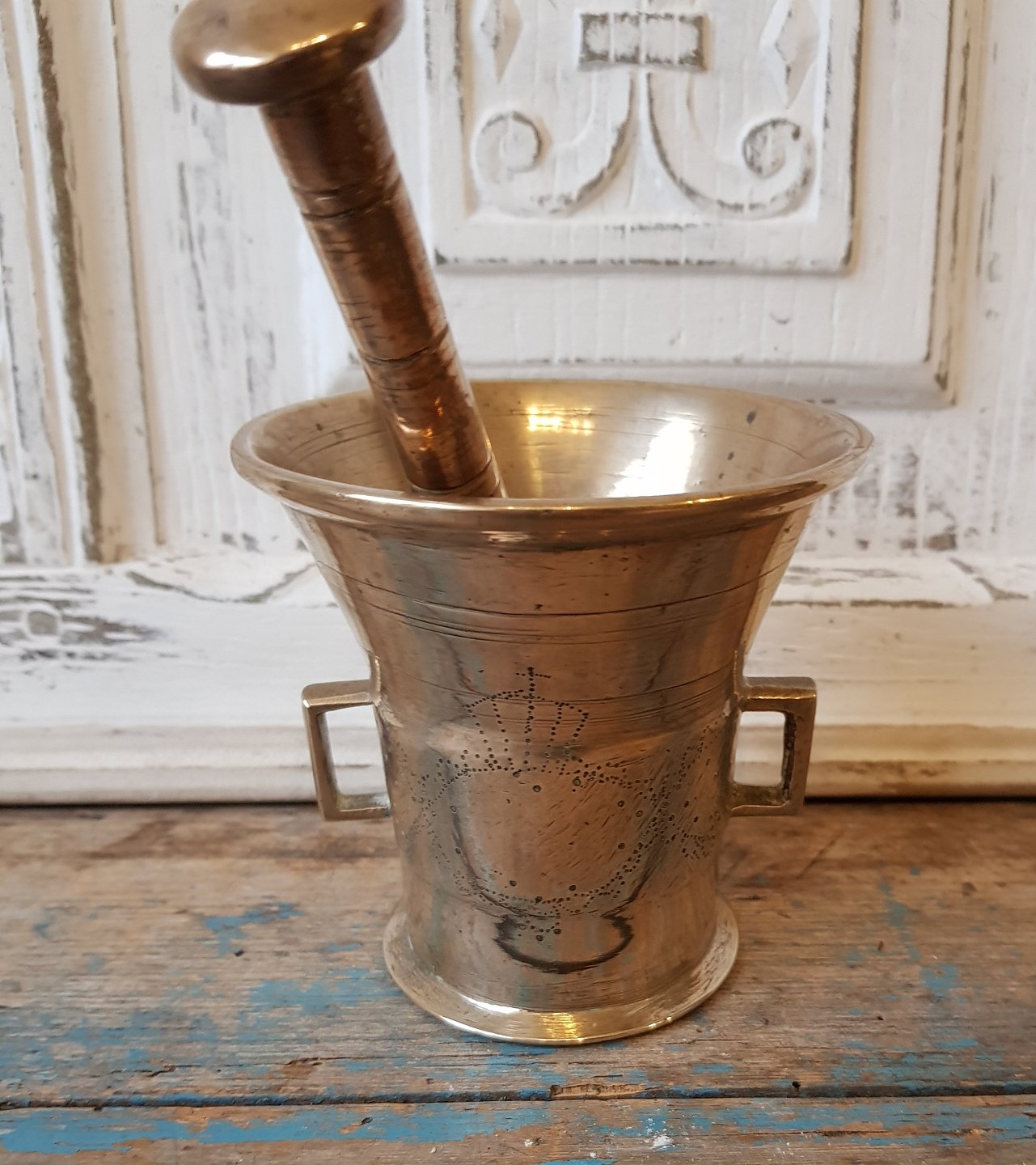 1800tals messing morter dekoreret med gravering i form af krone og årstal 1805.