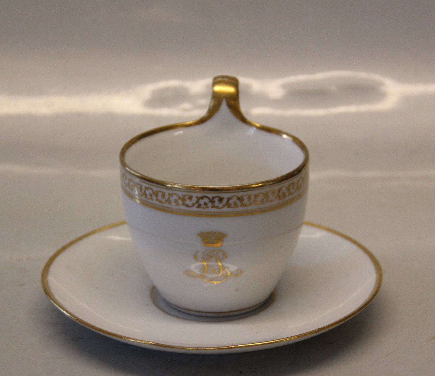 Kongelig Dansk Kgl. Antik højhankskop med SP Monogram 9 x 9.50 cm & underkop 17 cm ca 1790-1850